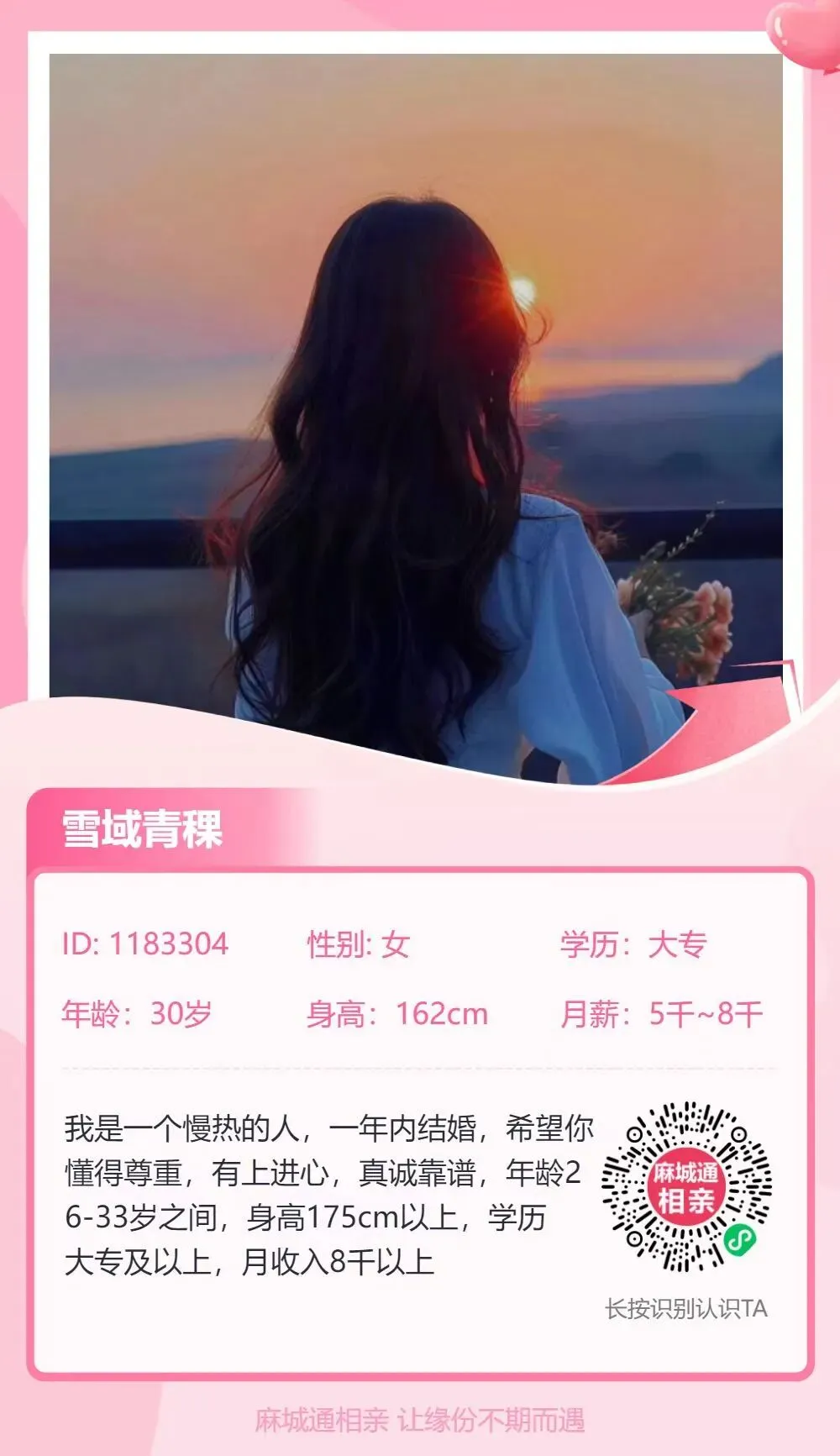 长按上方“麻城通相亲”识别小程序码,进入相亲交友页面,注册会员,添加详细资料,就能看到同样也在寻找爱情的那个他(她)哦!