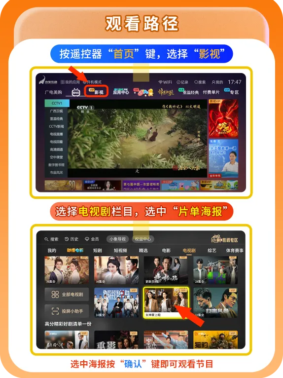 观影路径:按遥控器“首页”键-影视专区-短剧嗨看