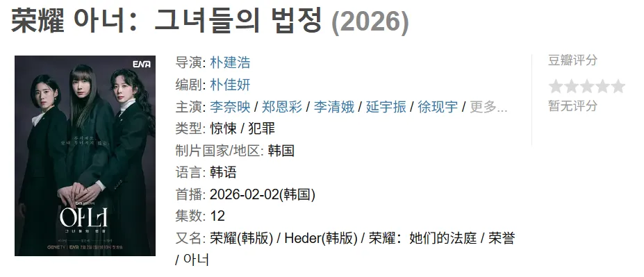 2026年2月2日,韩国ENA电视台上线的律政悬疑剧《荣耀:她们的法庭》(韩文名:아너:그녀들의 법정)以黑马之姿引爆全网。这部改编自瑞典神剧《Heder》的12集作品,由朴建浩执导、朴佳妍编剧,集结李奈映、郑恩彩、李清娥三大实力派演员,首播即创下3.1%收视率。