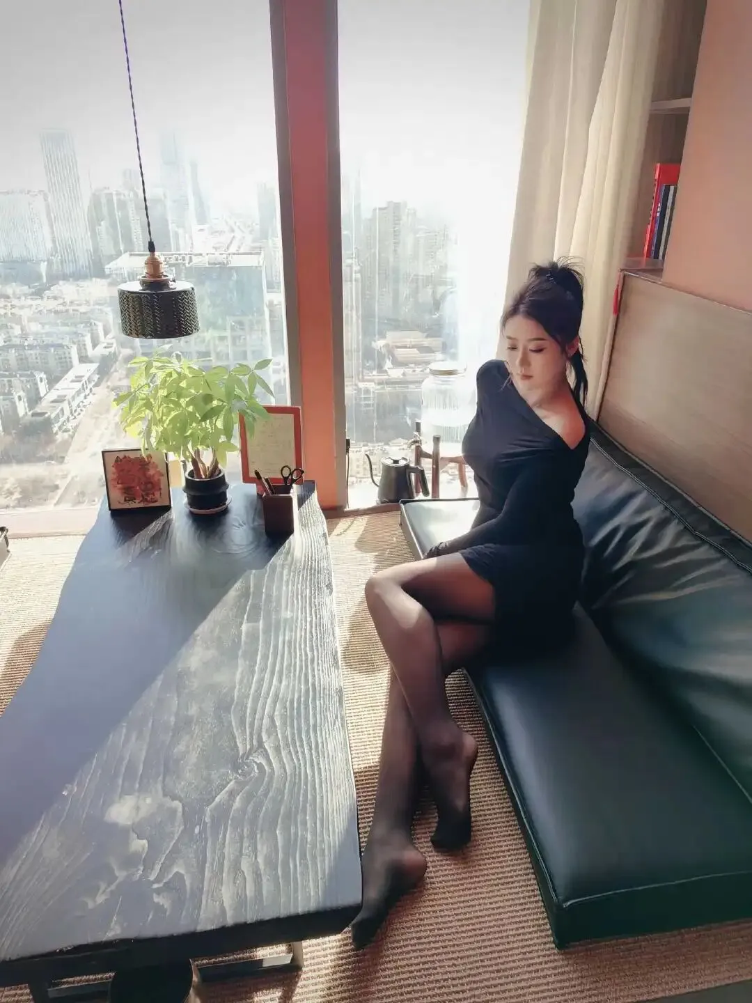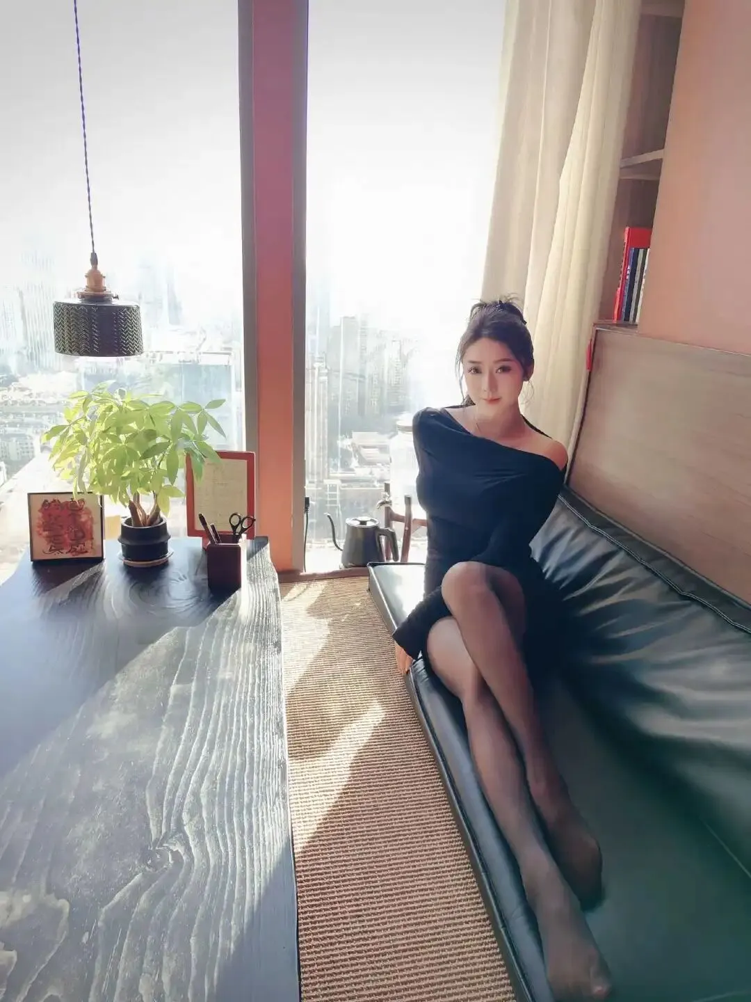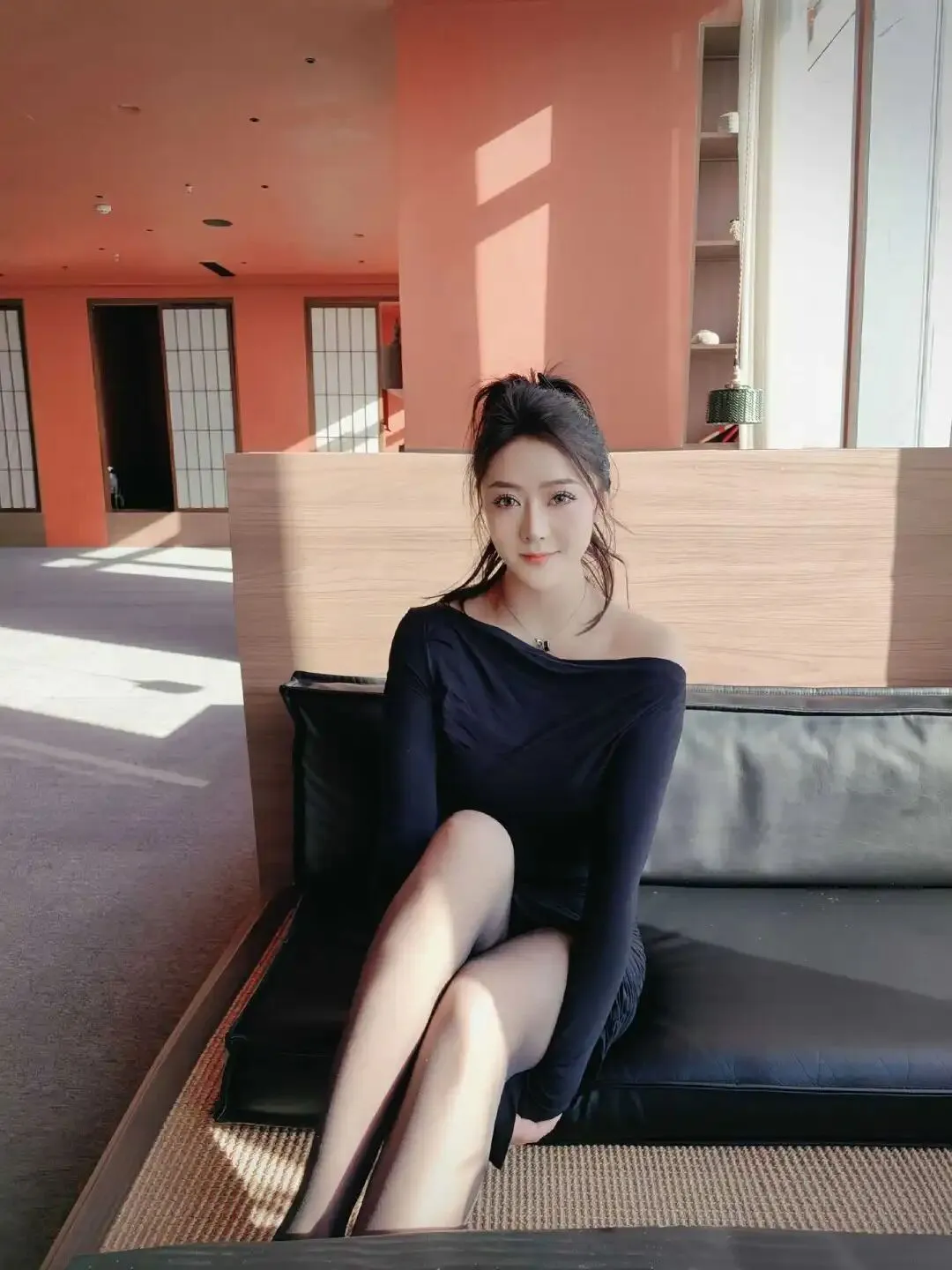 阳光透过落地窗洒进茶室,张新童XT坐在黑色皮质榻榻米上,一袭修身黑色露肩长袖连衣裙勾勒出她玲珑有致的曲线。裙摆微卷,露出修长双腿,搭配黑色丝袜与缀钻尖头高跟鞋,每一步都踩在视觉焦点上。