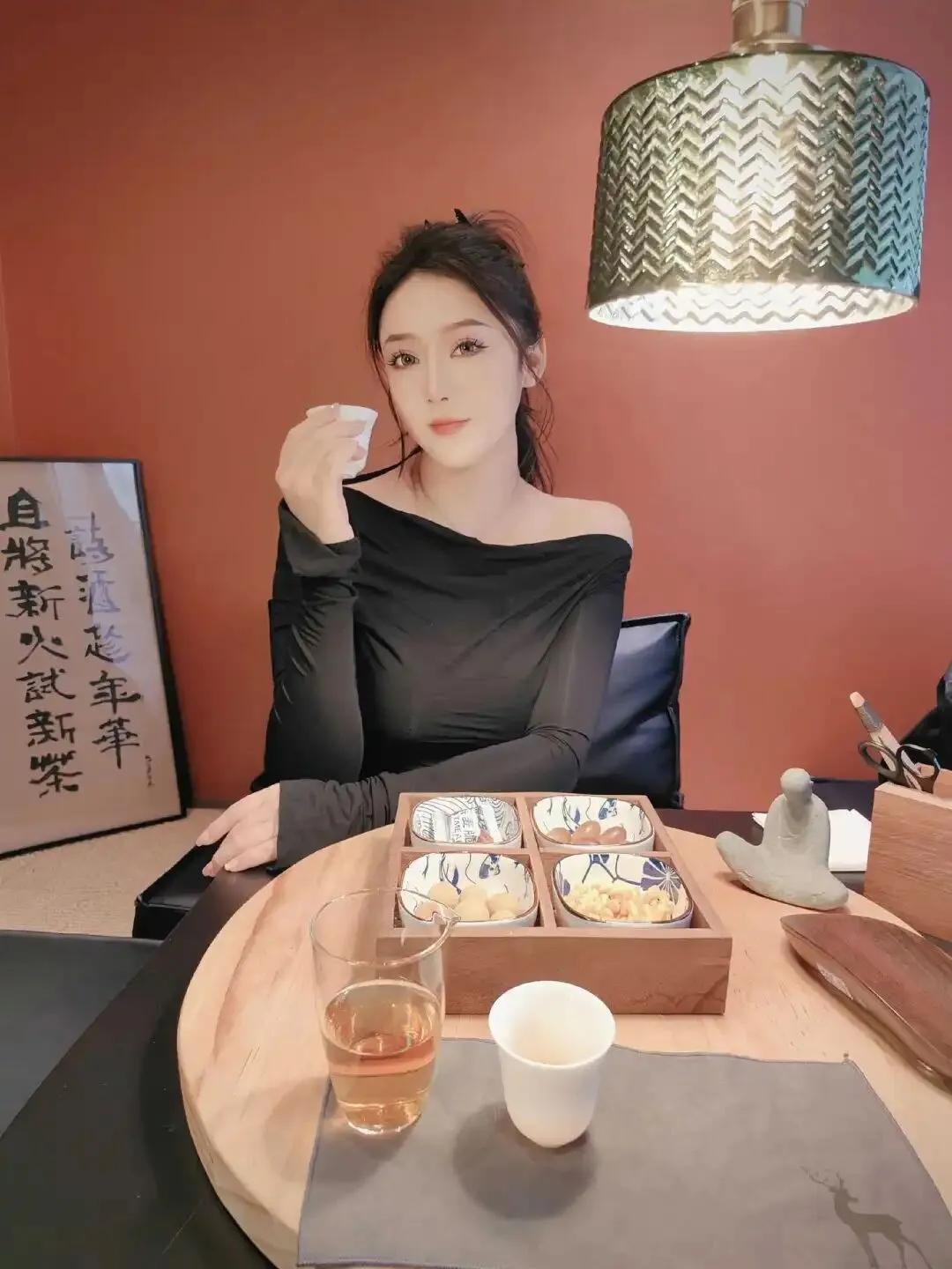 她将乌发高束成马尾,露出精致下颌线与小巧耳骨,妆容清透却眼神撩人,举手投足间尽显成熟女性的知性与魅惑。她轻捧茶盏,指尖修长,笑意温婉,仿佛时间都为她驻足。