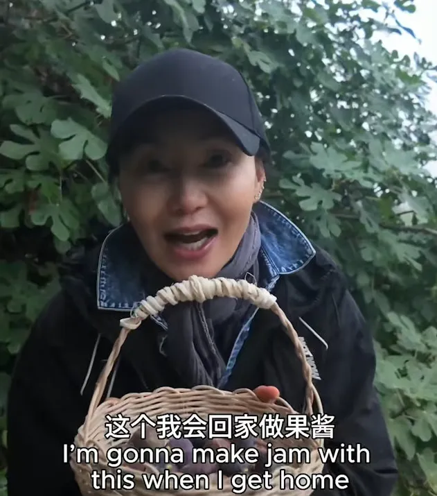 视频里的张曼玉,裹着头巾,挎着个竹篮,顶着细雨爬梯子摘无花果。