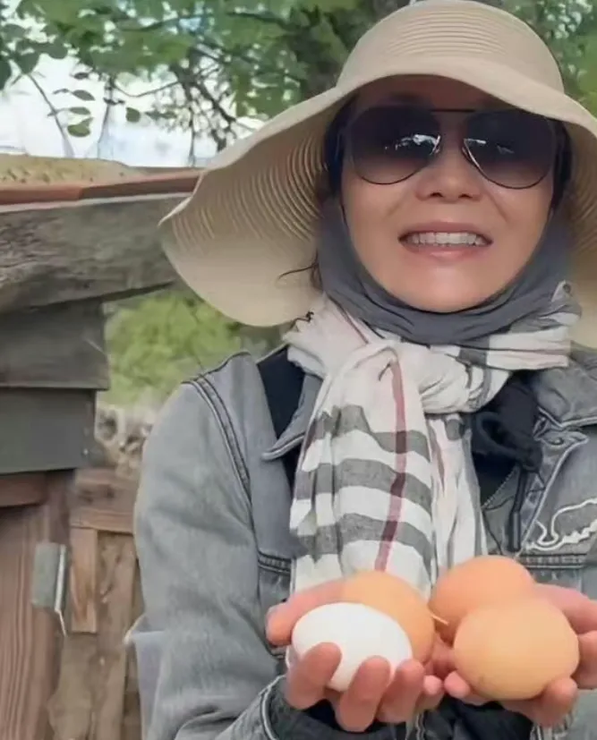 她甚至还给自己搭了个鸡舍,弯着腰在那问母鸡:“今天有没有蛋呀?”拿到温热的鸡蛋后,那眼神里的雀跃,比当年拿戛纳影后还高兴。
