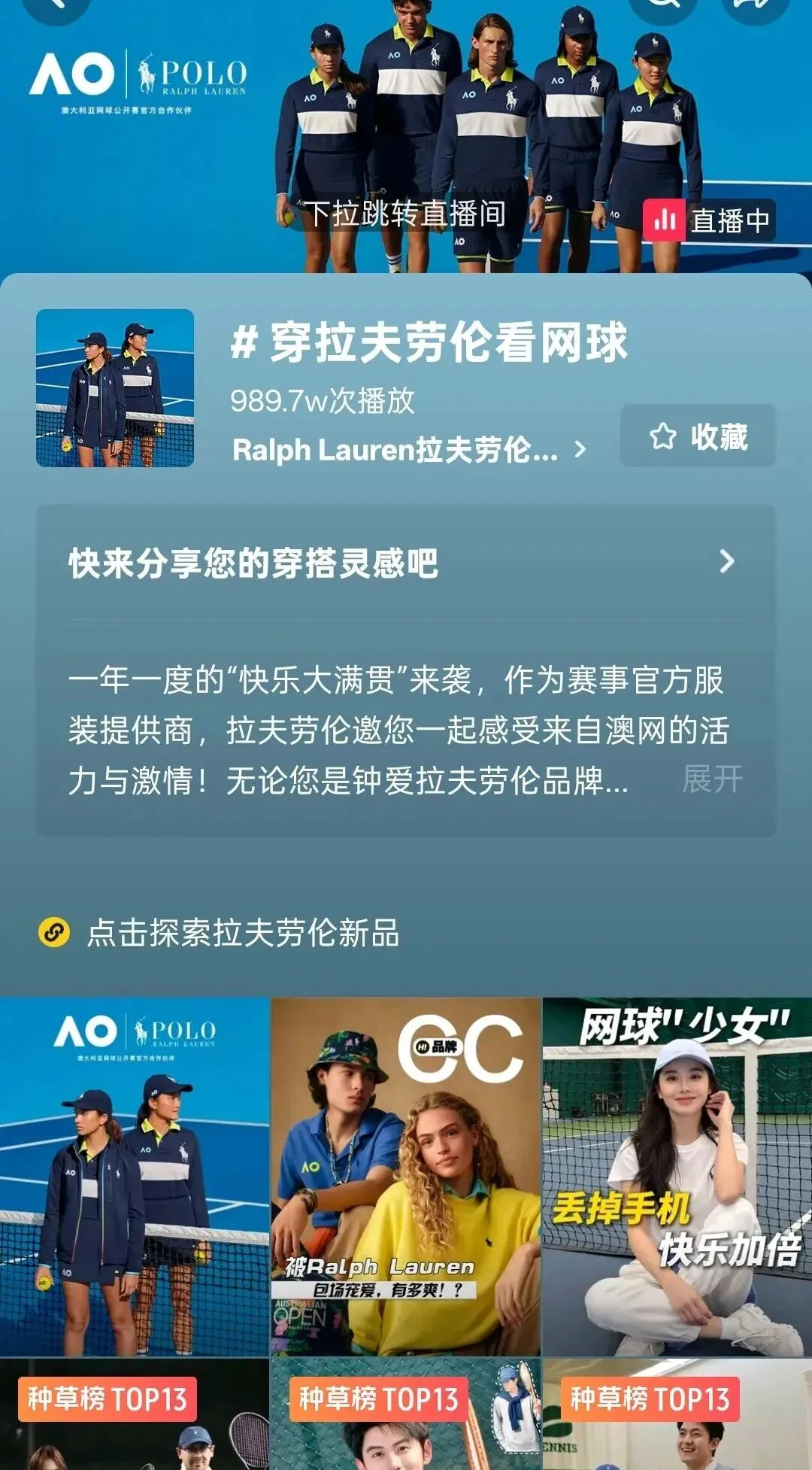 在后面的澳网直播中,品牌以“穿拉夫劳伦看网球”为叙事,自然而然地实现了联名系列的露出和种草。
