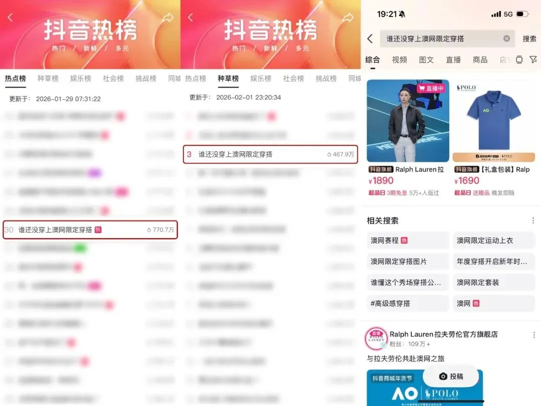 #谁还没穿上澳网限定穿搭,这一热点话题一经发布,便强势登上抖音站内总榜TOP30,占据种草榜TOP3,截至目前,热度还在持续破圈外溢,并在话题热度高峰时段,及时进行品牌话题关联,用户可以通过热点词直达品牌店铺页/商品页,大幅度缩减了“种草→搜索→购买”的决策路径,让话题热度高效转化为品牌的销量,何尝不是“种收一体”的闭环呢?