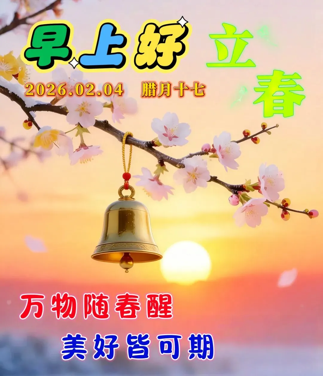 🌞立春到,问候来报道。💕让春暖花开的生活伴着你,🌷让春风得意的事业随着你,🌊让春意盎然的心情跟着你,🌻让春华秋实的幸福属于你。🎄祝立春快乐!💐