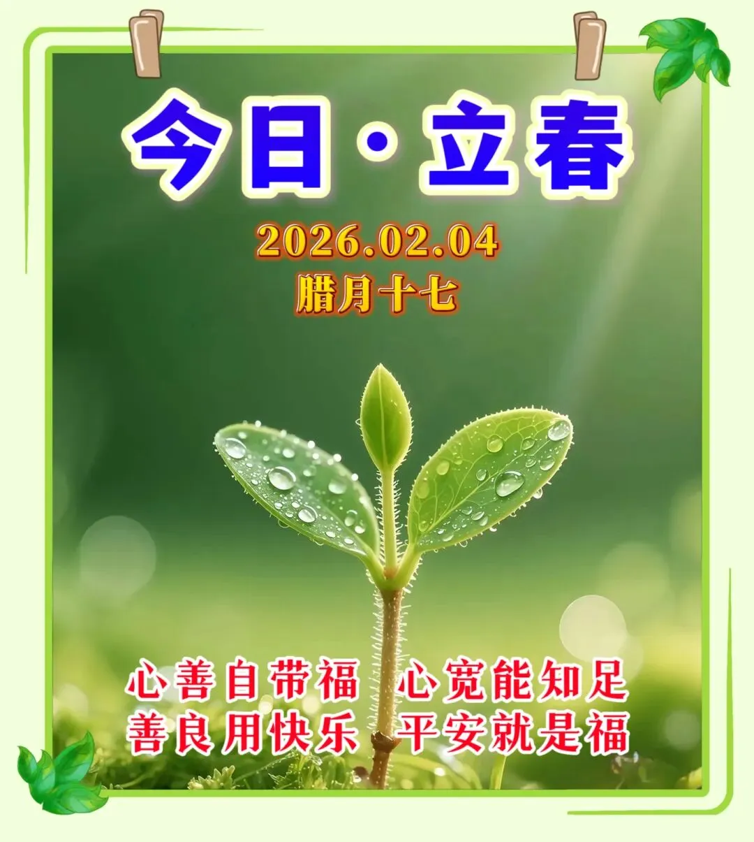 🧡立春之日,万象更新。💖愿你心境如春山般明朗,🍀生活如春水般流畅。🌱 在立春之际,祝愿你心情愉悦,生活顺畅,🍭像大自然一样焕发新的生机和活力。🌅