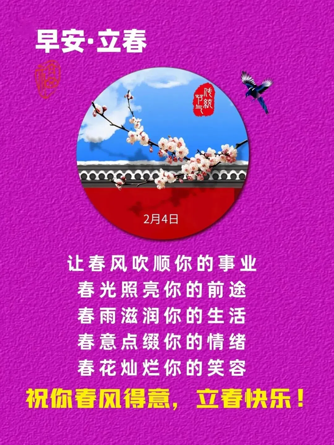 2、春打六九头,立春是年头;艳阳送温馨,冬去春归喜;迎春家和睦,好事堆成垛;立春福满门,吉祥更滋润;幸福万年春,和谐快乐追。立春好节气,祝您生活美!