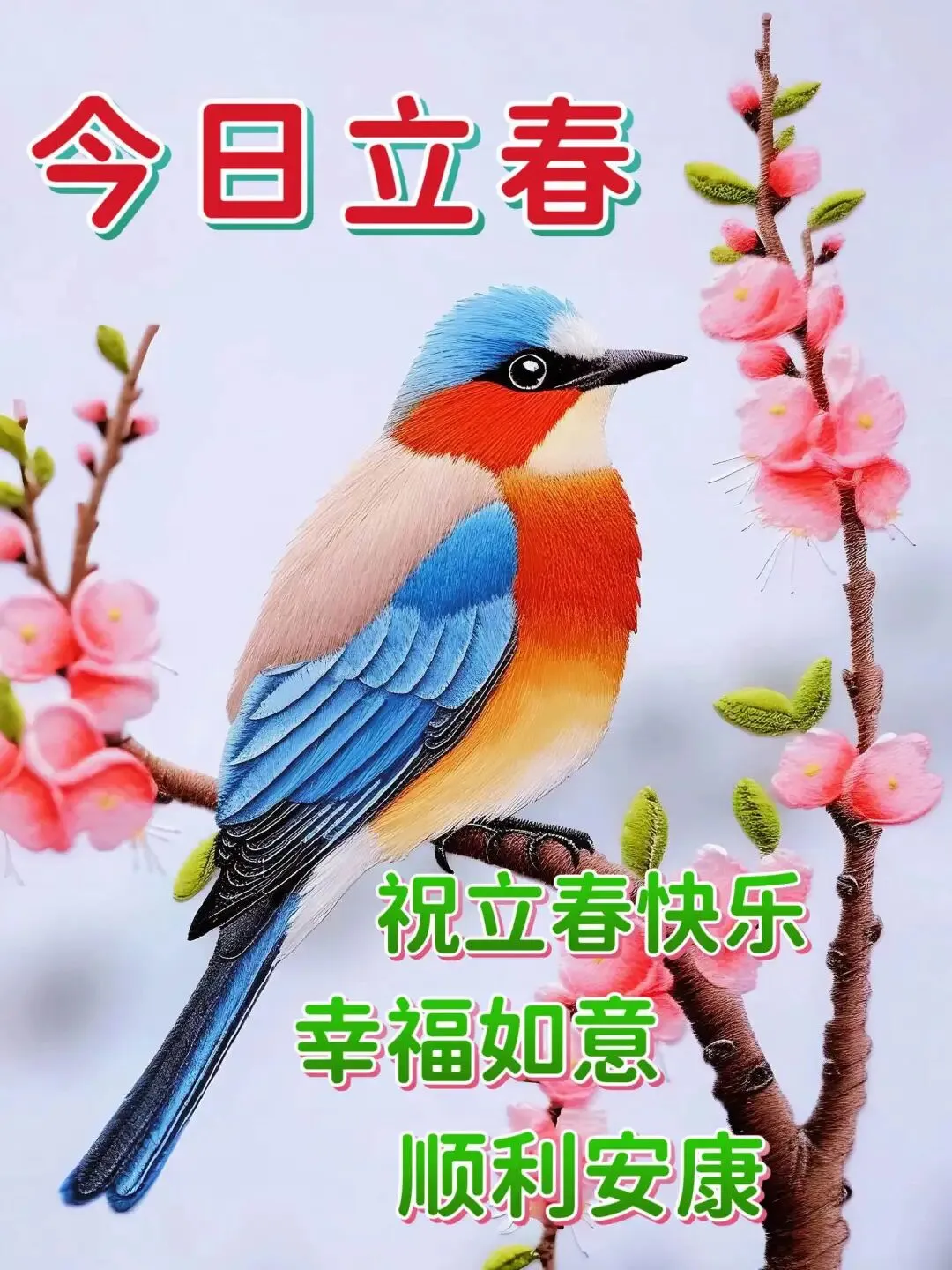 2、春打六九头,立春是年头;艳阳送温馨,冬去春归喜;迎春家和睦,好事堆成垛;立春福满门,吉祥更滋润;幸福万年春,和谐快乐追。立春好节气,祝您生活美!