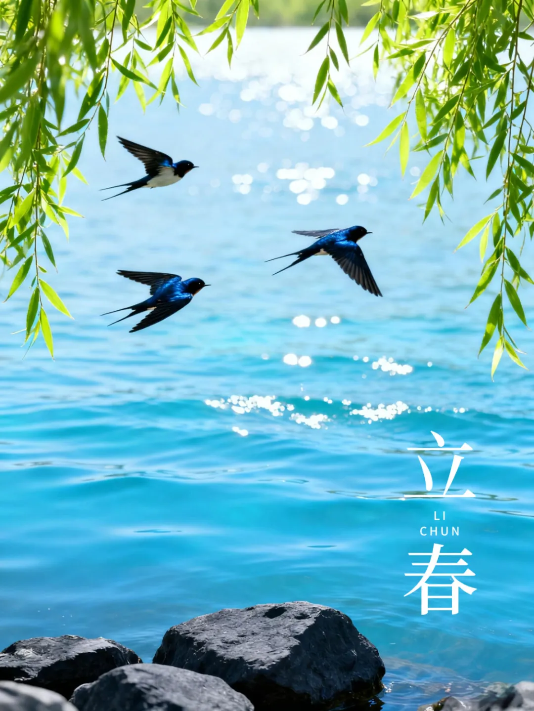 双飞燕子几时回,夹岸桃花蘸水开,春雨断桥人不渡,小舟撑出柳阴来,立春愿你乐开怀,好运连连排成排,事业成功登高台,财源广进八方财,身体健康无病灾,吉祥如意福如海。早上好~