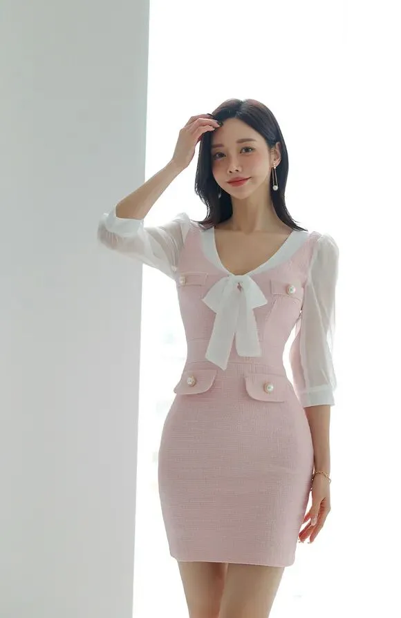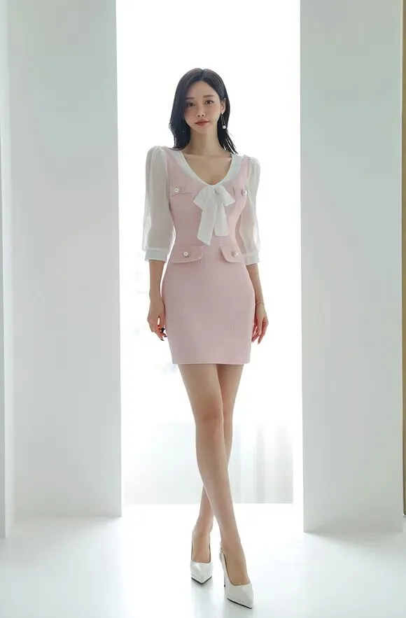 >美女模特孙允珠豆沙浅粉古典西洋芭比包臀裙