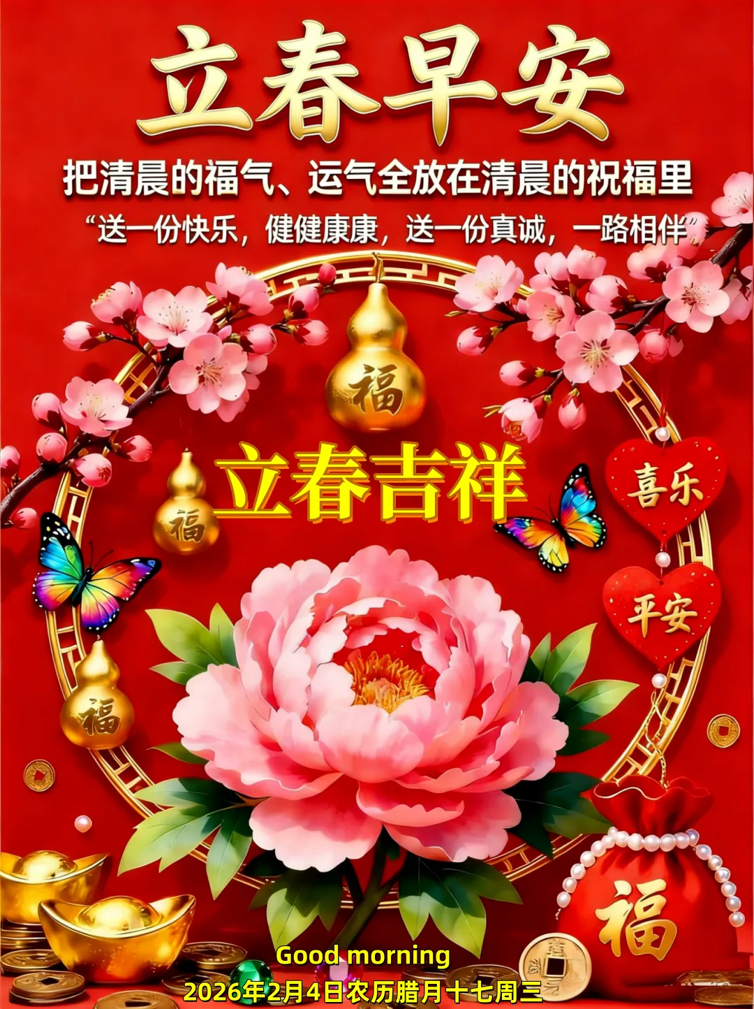 5、立春养生三要点,时刻装在心里面,乍暖还寒要春捂,党参枸杞汤里煲,粥类饮食养脾胃,山药大枣都是宝,戒怒护肝心情爽,芹菜豆芽多补给。温馨关怀送给你,快乐安康都聚齐!