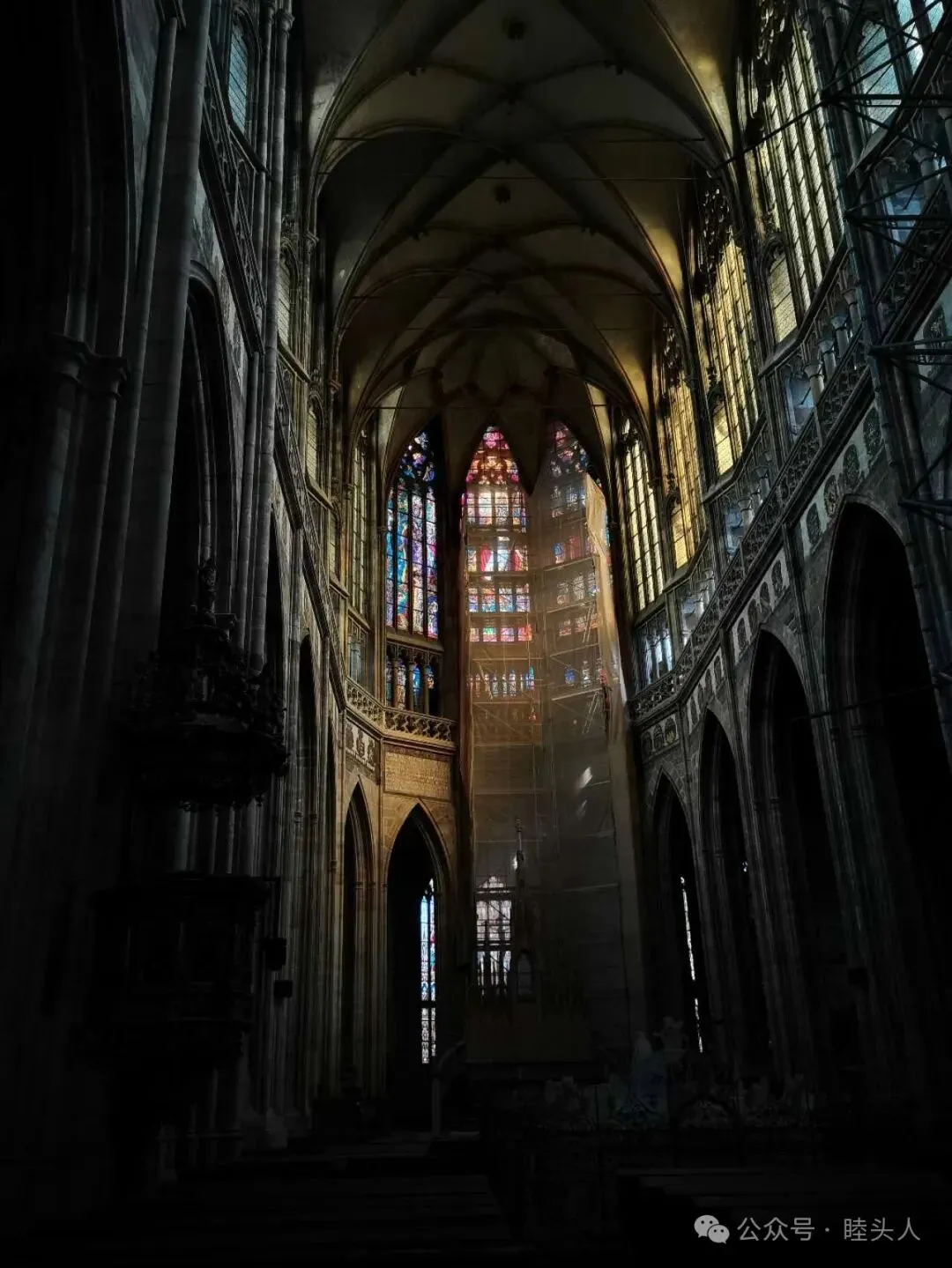 圣维特主教座堂坐落在城堡之中,作为一个哥特式的教堂他并不比科隆大教堂大,但是气氛却更为冷冽,与在文艺复兴时期普遍接受了巴洛克风格的装饰不同,19世纪教堂重新修整时,特意去除了浪漫柔和繁复的巴洛克装饰,反而把哥特式的恐怖发挥到了极致。里头装饰随处可见的骷髅(圣灵),玫瑰窗大量采用了红色、粉色、蓝色的色调,使得内部的光线更为昏暗,关键处点被上电灯,不然难以看清。与科隆大教堂内部分为两层相比不同的时,可能整体高度圣维特主教教堂稍矮一些,但因为只有一层,所以更为尖耸。右侧有些窗户在整修,落下纱布,恰巧在入口旁,仿佛中世纪隔绝低贱与高贵的帷幕。