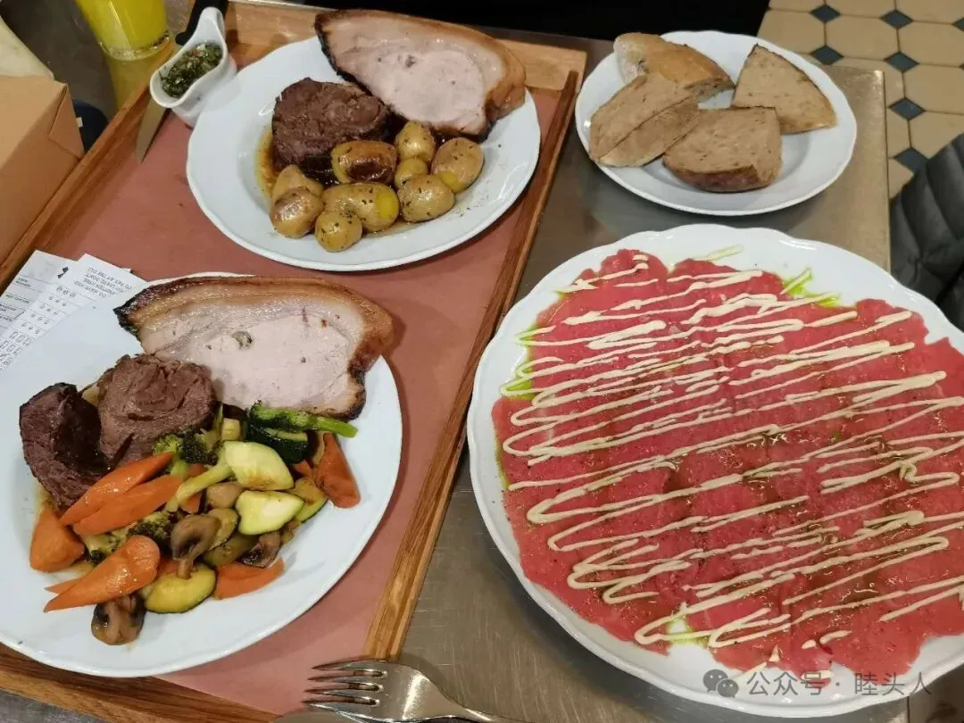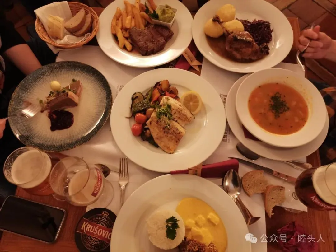 走过了布拉格著名的“跳舞的房子”,我们终于寻找到一个可以就餐的地点,可惜依旧火爆,服务员说可以提供“站食”,此时已经过了九点,我们不再挑剔,立在过道里占好位置,生怕站食的机会都被人抢走。但布拉格的食物和价格属实惊艳了我们,我点的兔腿肉滑嫩多汁,配上苹果酸奶酱鲜甜解腻,C君和L君也对他们的牛肉和鹿肉赞不绝口,可惜分量略少(或是我们食量过大),最后又添了一份泡在奶油朗姆酒里的面包。上面撒上糖霜,叉起来吃,浸泡酒液里的部分奶香浓郁,朗姆酒酒味也很好地中和了奶油的甜腻,未浸泡的部分软糯喷香,外皮得到略微炙烤,配上糖霜出人意料的并不特别甜,口舌生香。三匹饿狼旋风扫净,此时配菜沙拉都还没来得及端上来。美中不足啤酒泡沫过多,啤酒泡沫有人爱之,有人恨之,我是后者。战斗结束,付款,走人,化开账单,人均20欧,感叹实惠至极,又不免怒斥一番德国高昂物价。又寻到一处酒吧饮酒,我不懂捷克语,服务员英语也踉跄,胡乱点了一杯,香料味极重,不喜欢,喝完回宾馆,当夜“认床”,直到凌晨终于呼呼大睡。
