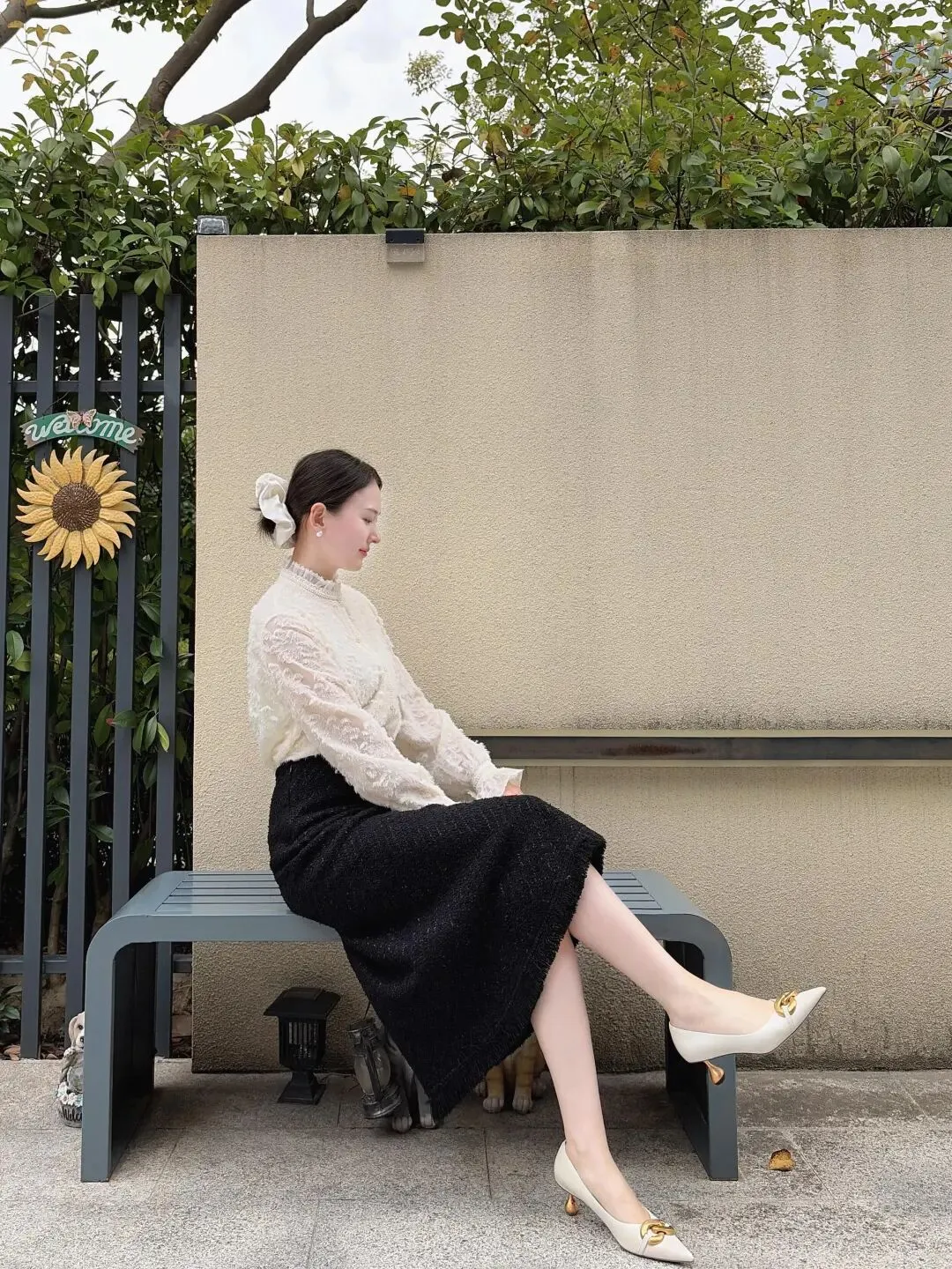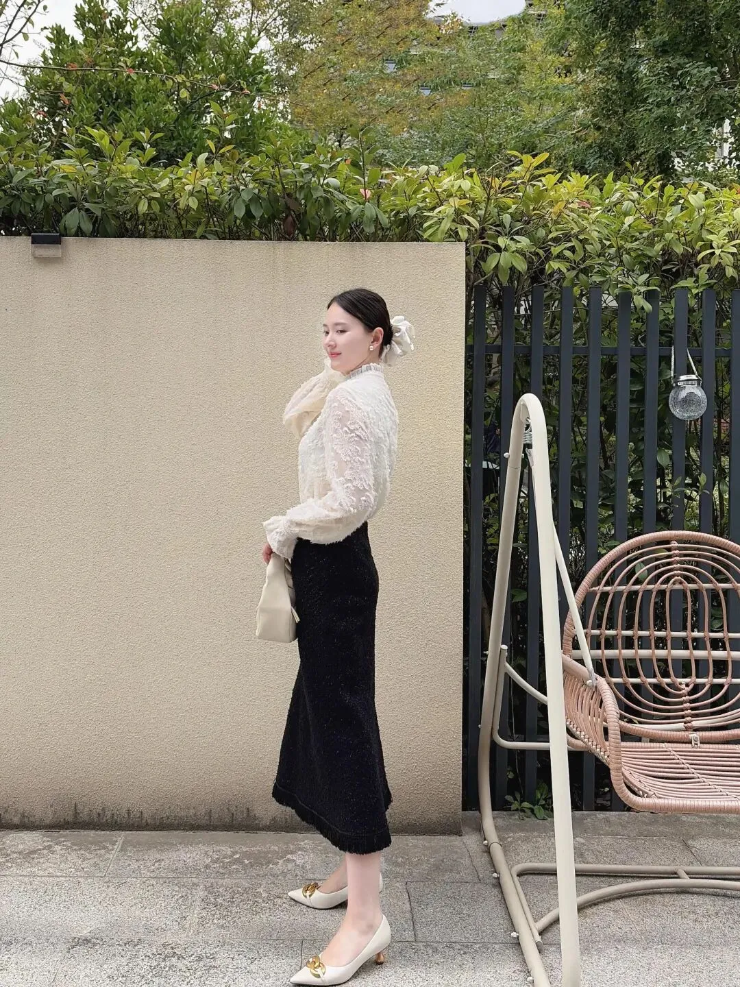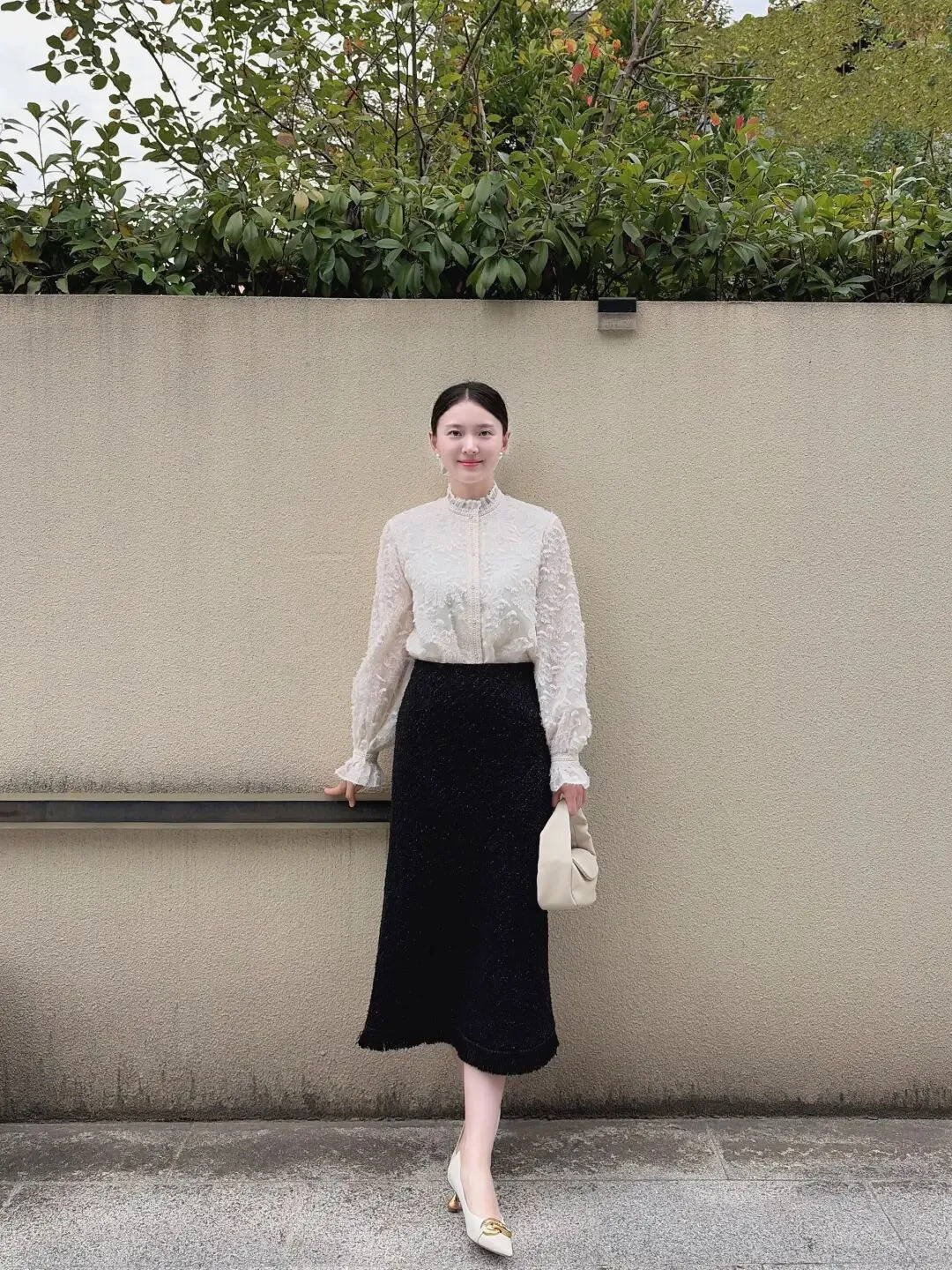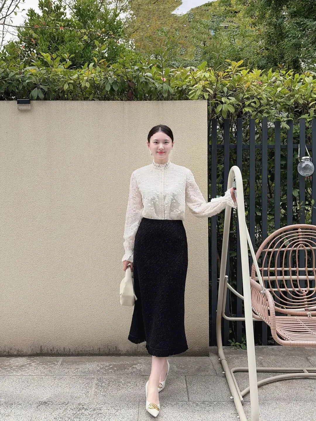 白色蕾丝衫搭黑色针织半裙,立领设计揉进复古韵味,收腰版型衬出纤细腰线!蕾丝镂空添了温柔感,往米色墙前一站,复古又精致~配米白小方包和奶白色尖头鞋,色调统一秒变大长腿,扎个低马尾别上白色发夹,往藤椅上一坐,松弛感和气质感直接焊死!氛围感绝对赢麻了~