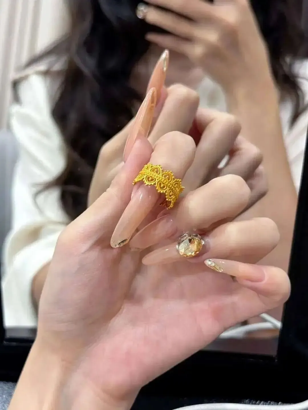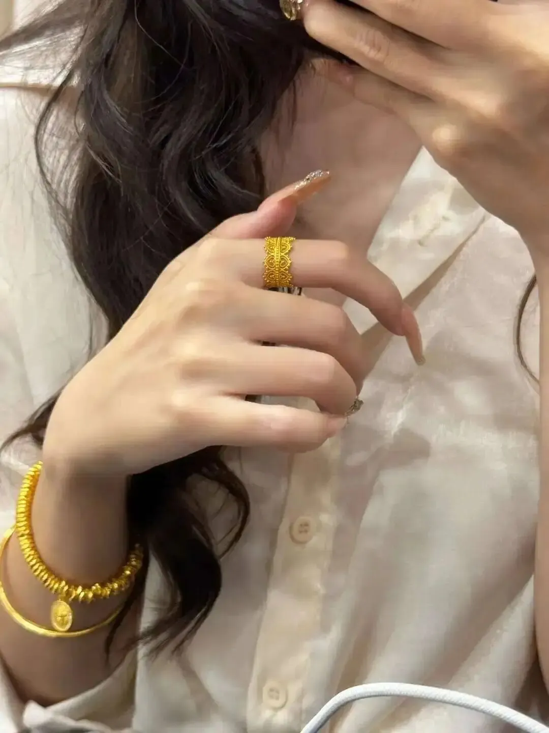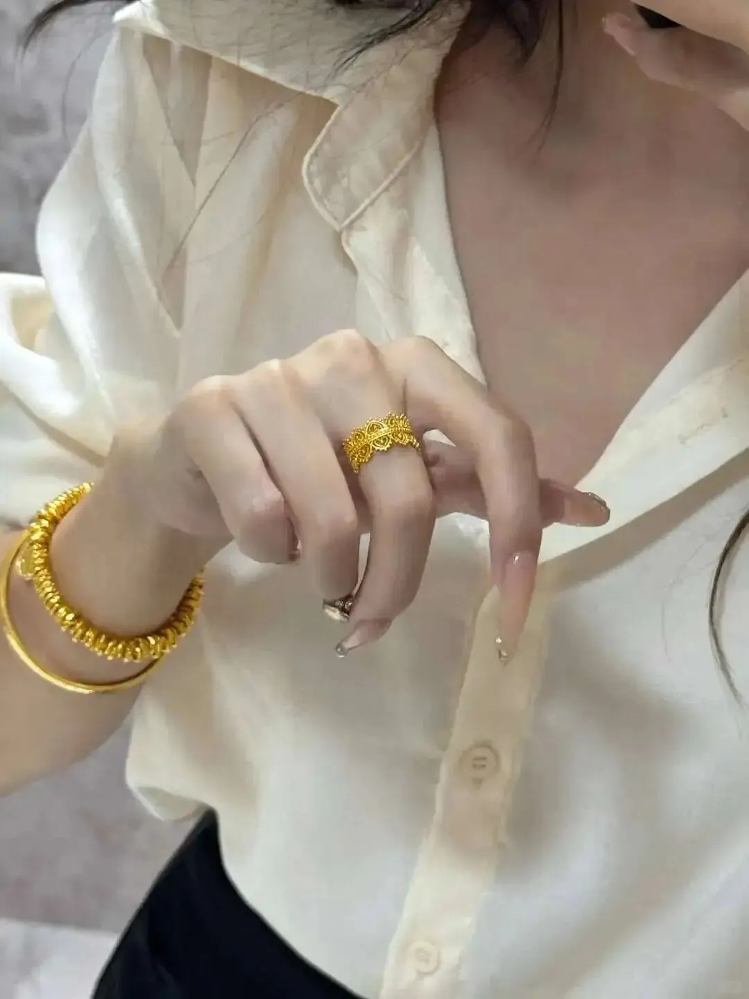 足金的颜色偏暖、偏深,带着点旧时光的沉稳;18K的蕾丝戒偏冷、偏清透,带着都市的利落。