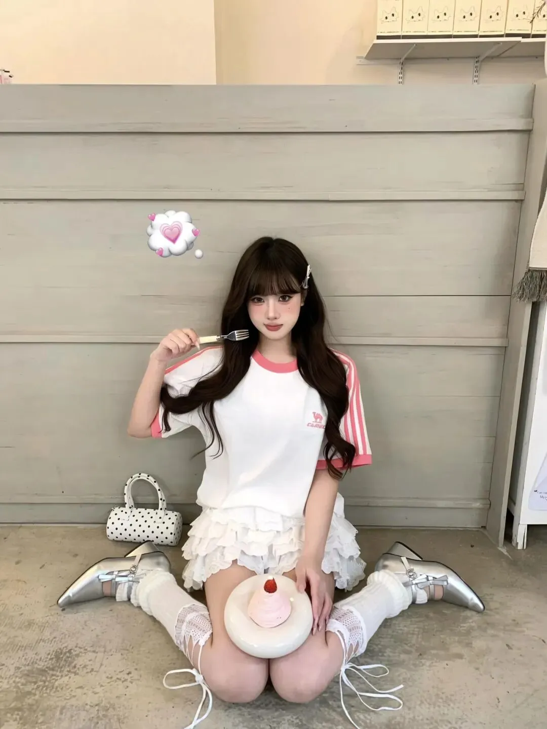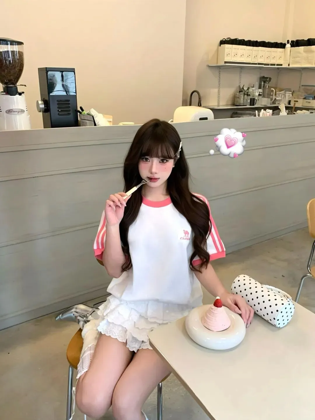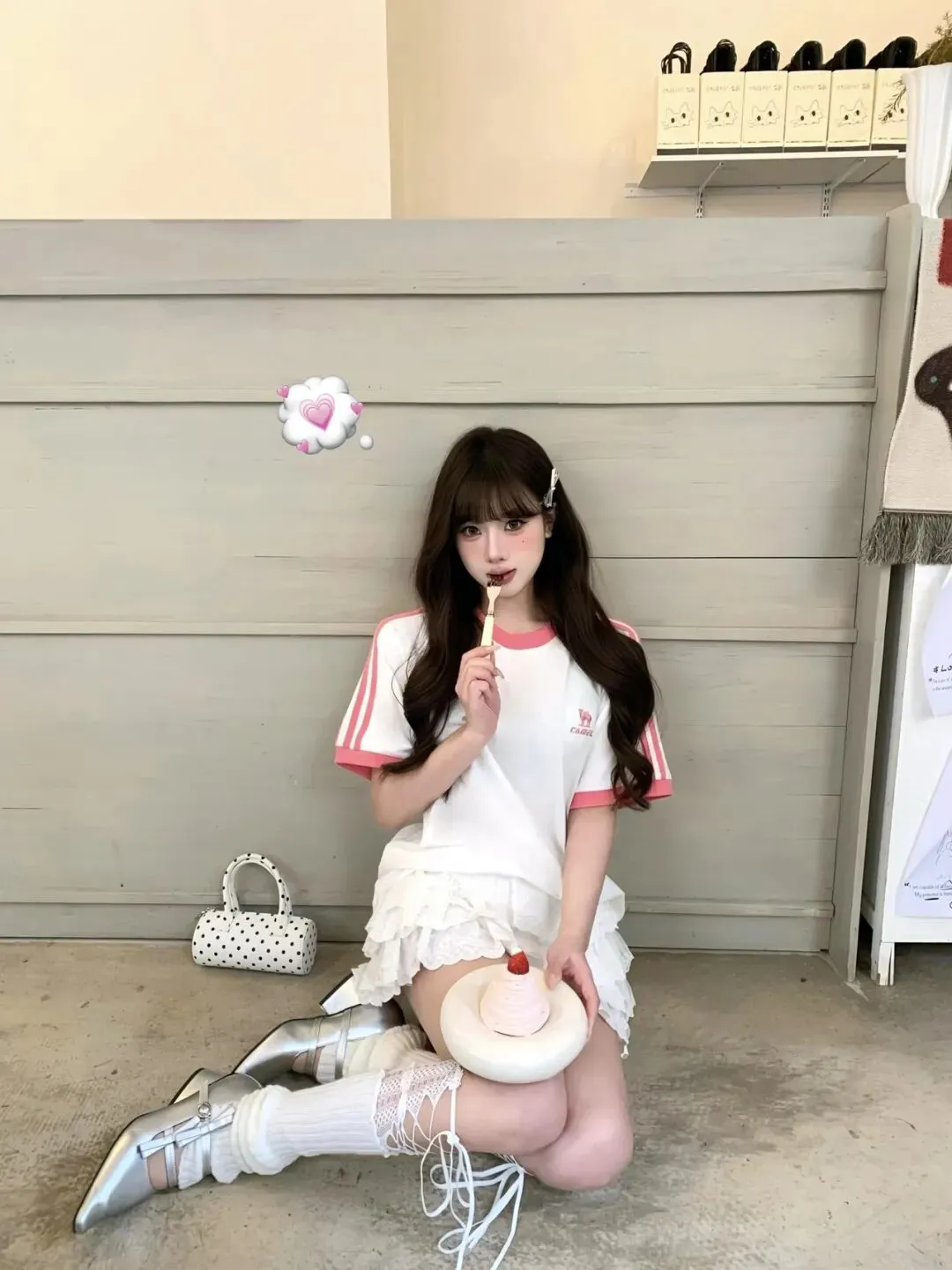 最后我干脆站在镜头前把包挎在手臂上,手势夸张一点,发丝甩开一点,裙摆就会自然鼓起来,那种“上衣是元气、下装是公主、配饰是甜品”的三段式节奏,一下子就完整了;我觉得自己不再是在咖啡店等一杯饮料的人,而是把今天的心情穿成了一套能被记住的样子:白色是底色,粉色是温度,银色是光,波点是俏皮,而那只草莓蛋糕只是恰好路过,替我证明——这套穿搭本来就该这么甜。