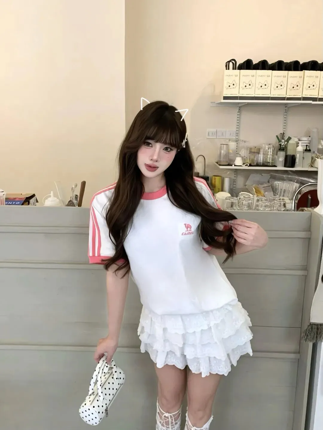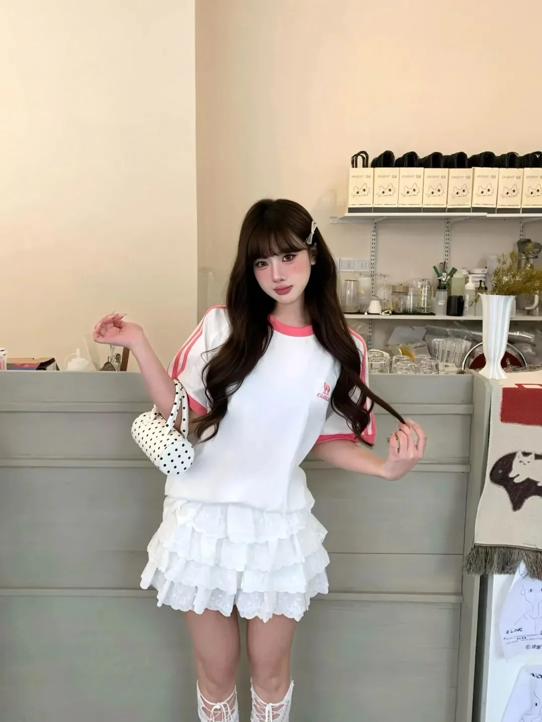 那天我本来只是想去喝一杯不太苦的拿铁,结果一推开门就被吧台后面那排整整齐齐的器具和干净的奶油色墙面骗得心情发软,像走进一块还没切开的蛋糕胚——于是我临时改了计划,把“随便穿穿”换成了“认真甜一下”。我先从上衣开始定调:白色运动T看起来简单,但粉色领口像草莓边缘那圈微微发亮的糖霜,袖子两道粉色条纹又有点校队运动服的感觉,刚好把“乖”和“俏”揉在一起,所以我把它穿得松松的,让肩线自然垂下来,留出一点慵懒;下装我偏要反着来,选了层叠蕾丝的蛋糕裙/荷叶边短裙,裙摆每一层都像奶油挤花的褶,走路会轻轻弹一下,和上衣的运动感碰在一起,反而更像那种“你以为我只会元气,其实我也很会浪漫”的反差。头发我刻意烫成大弧度的长卷,刘海压得很乖,侧边用银色小发夹固定住,像把一束光别在耳边;我没有用夸张的首饰,只在脖子上留一点细链条,让整体仍然轻、干净,给裙子的蓬松留出呼吸的空间。刚坐下的时候我还在想,这套会不会太“甜品系”——直到服务员把那只粉色旋纹的小蛋糕放上桌,草莓顶端红得像刚点上的腮红,我突然觉得今天的穿搭就该和它一个色谱:粉领口呼应草莓,白蕾丝呼应奶油,银鞋负责把光泽感提起来,让整套不至于软成一团。