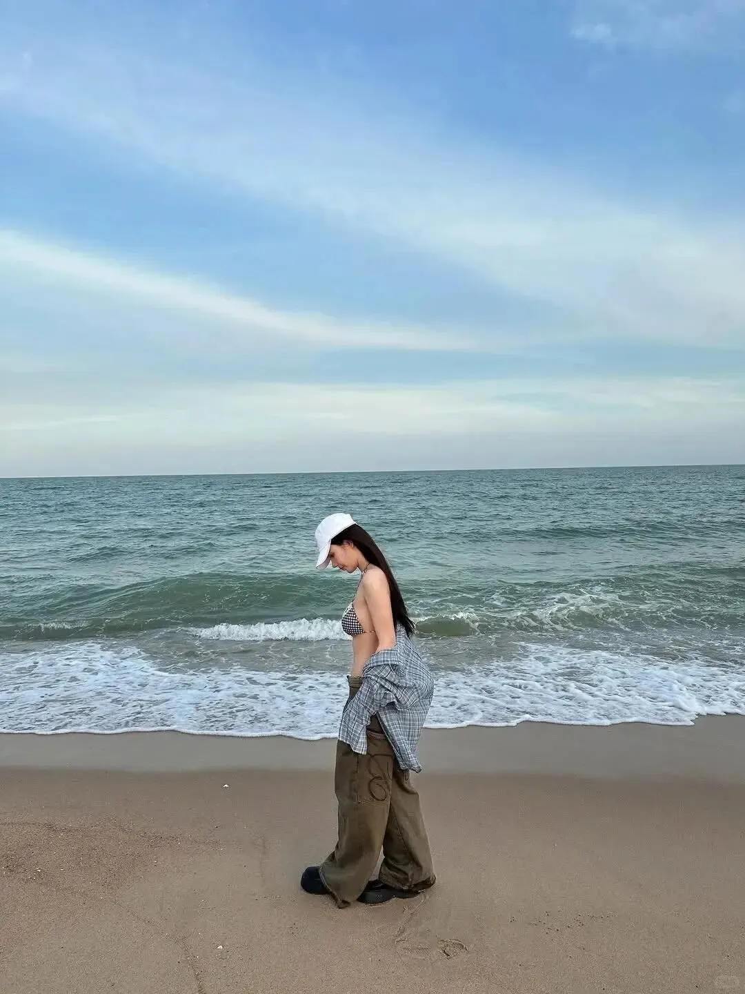 我是个自由摄影师,为了找一组“落日与海”的主题图,蹲在这片无人海滩三天了。今天终于等到了绝佳的光线,却被一个闯入镜头的身影勾走了全部注意力。她穿着米白色的吊带长裙,冷白的皮肤在橘色落日下泛着暖融融的光,长发被海风卷得凌乱,发梢沾着细碎的金砂,赤脚踩在被晒得温热的沙滩上,脚踝纤细得像一折就断。她弯腰捡起半片贝壳,肩线流畅得像精心勾勒的曲线,领口处露出的锁骨陷成小小的窝,看得我喉结滚了滚。我鬼使神差地走过去,开口时声音都有点发紧:“你好,我是摄影师,能不能请你当我十分钟的模特?”她抬头看我,浅棕色的眼睛里盛着落日的碎金,冷淡地瞥了我一眼,却没拒绝,只是轻轻“嗯”了一声。