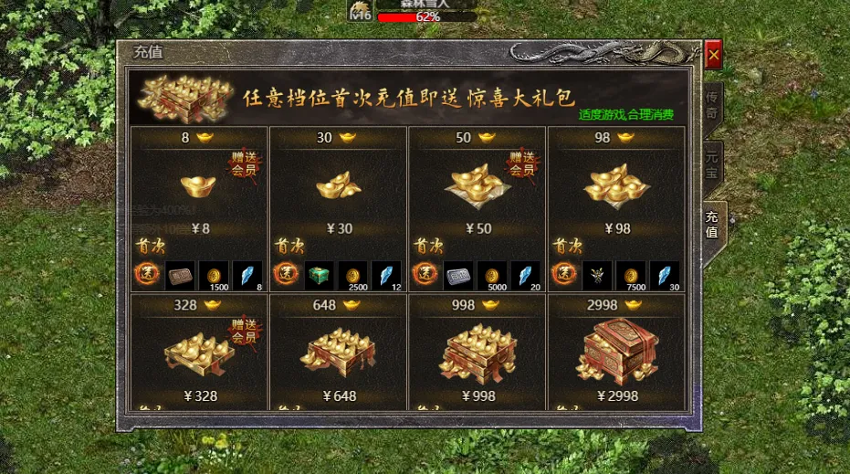 优先买强化石、技能残卷(提升战力必备),不买外观类道具(战力提升有限);元宝留着买创造宝石(合成高阶装备)。