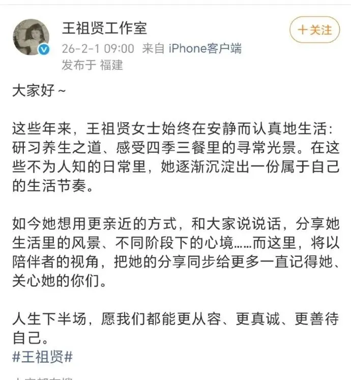 同时还发了篇小作文,说王祖贤一直在安静又认真的生活,现在想用更亲近的方式和大家说说话。