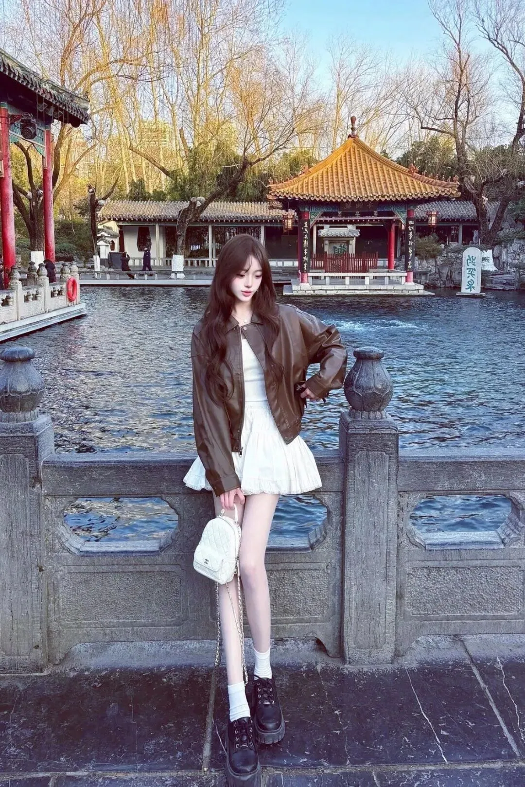 站在古色古香的园林里,阳光洒在身上,整个人都透着一种清冷的氛围感。白色的小挎包小巧精致,刚好点缀了整体的色调。脚踩一双厚底小皮鞋配上白袜,不仅拉长了腿部线条,还多了一份学院派的乖巧。不需要多复杂的配饰,光是这身配色就足够显白高级。那种“富家千金”出游的松弛感,大概就是这样被穿出来的吧!