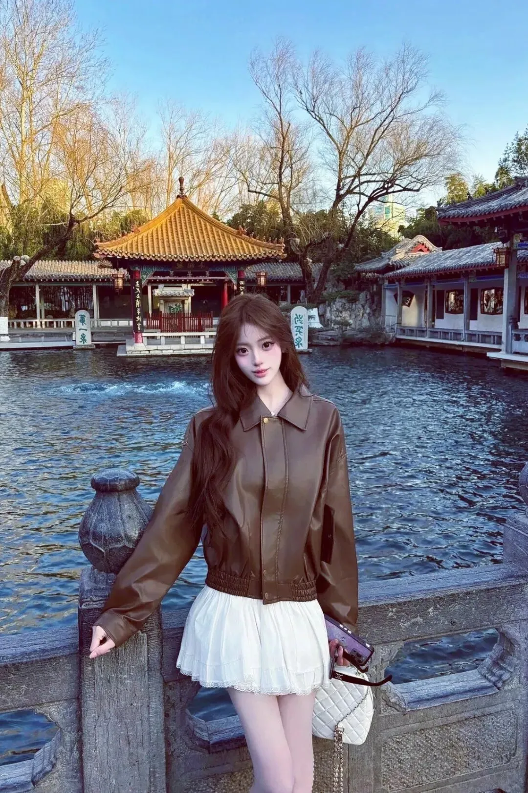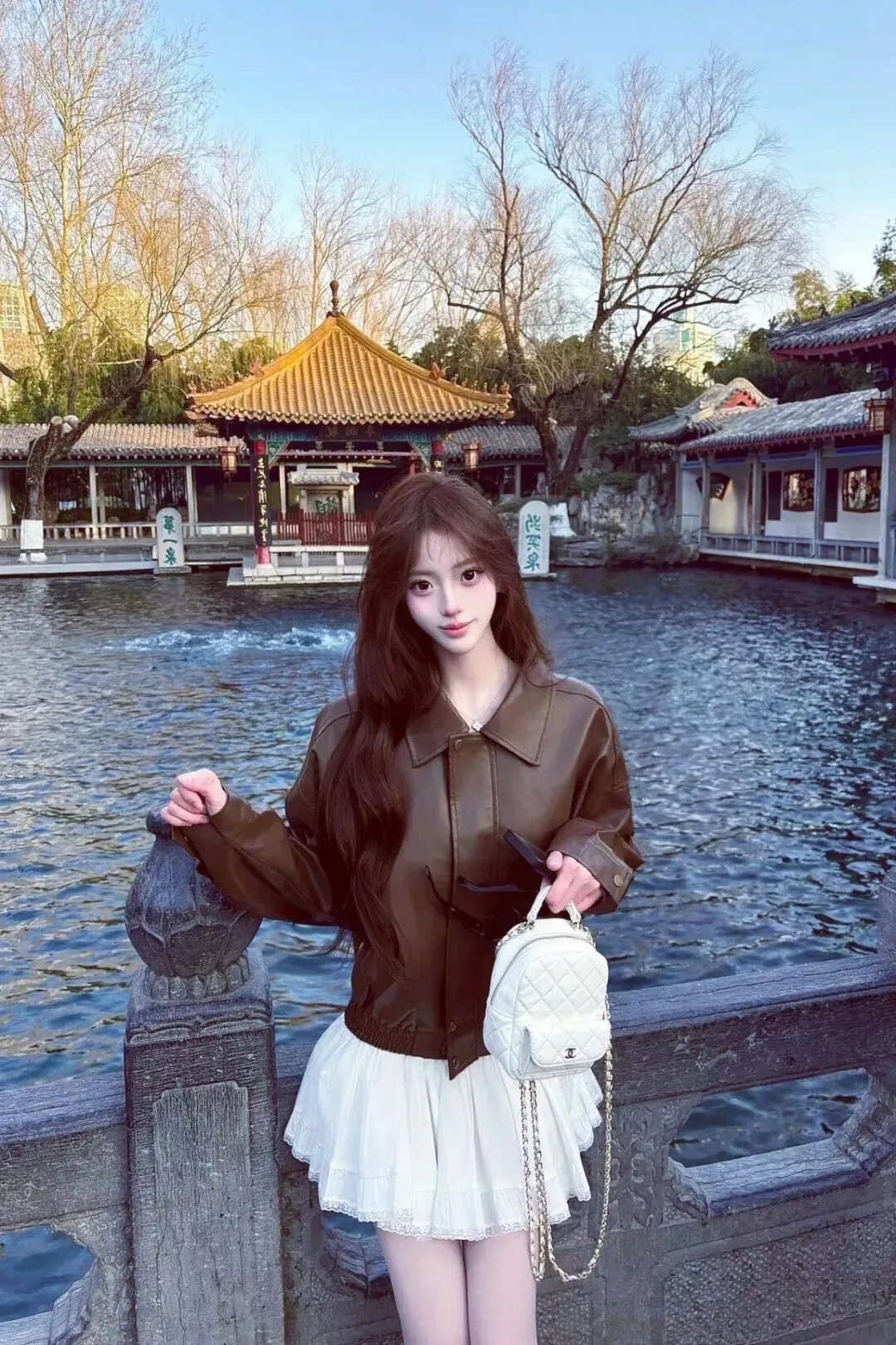 这一套真的太会拿捏那种“不费力的精致感”了!深棕色的皮衣自带一种复古的硬朗感,本以为会很难搭,没想到配上一条层层叠叠的白色蕾丝裙,瞬间就变得温柔又灵动。这种硬挺与柔软的碰撞,简直是甜酷女孩的本命穿搭。