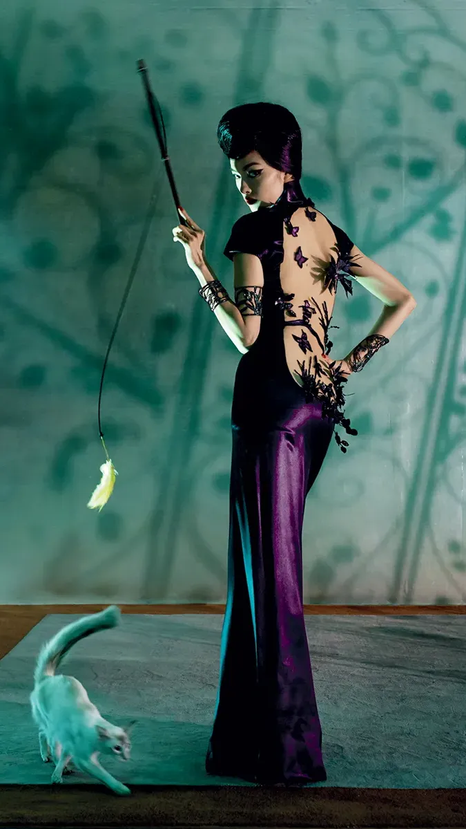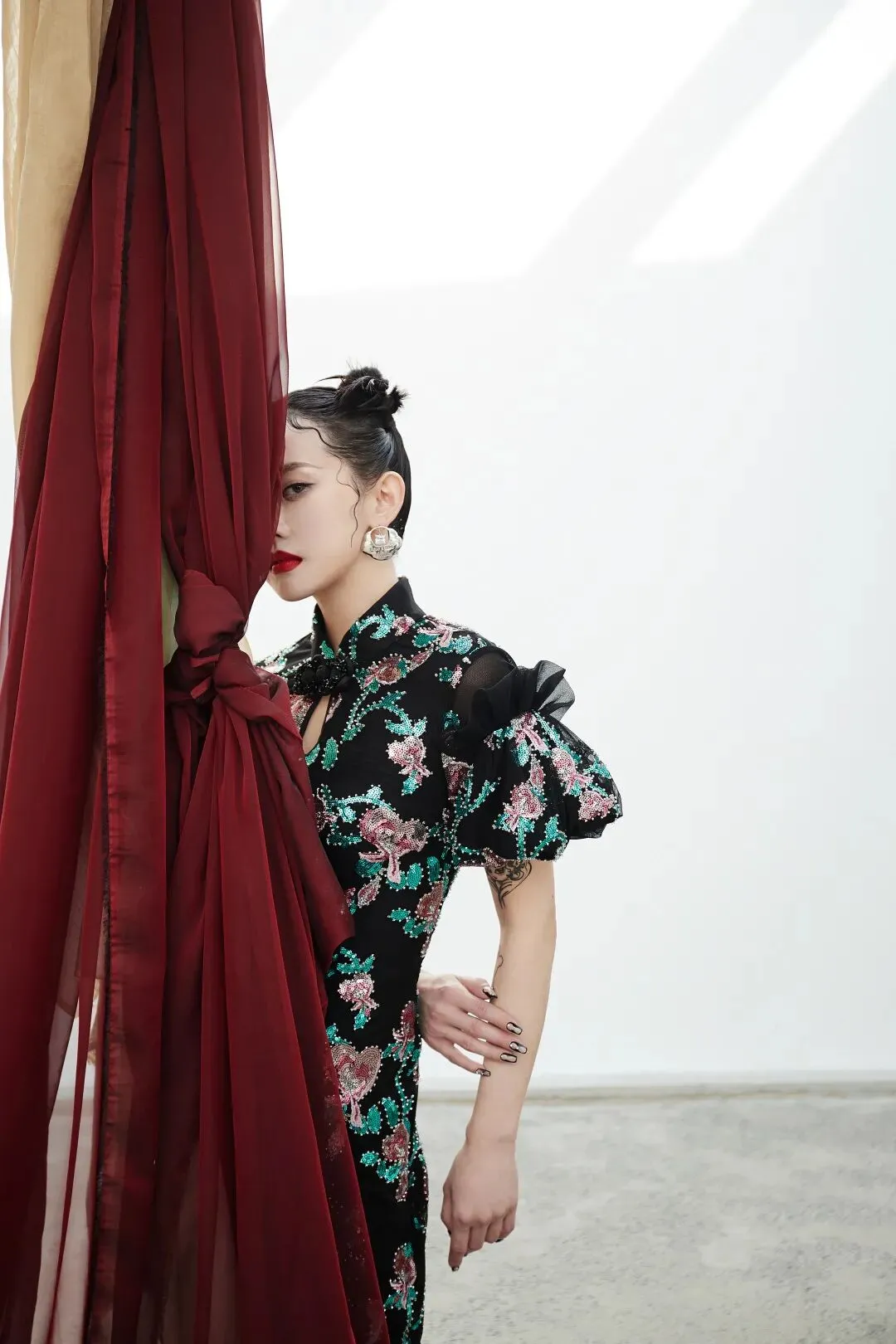 抽皱的下摆巧妙的将旗袍的开衩设计解构重组,塑造出全新的花苞廓形。这也是对「新中式」别开生面的一种尝试。