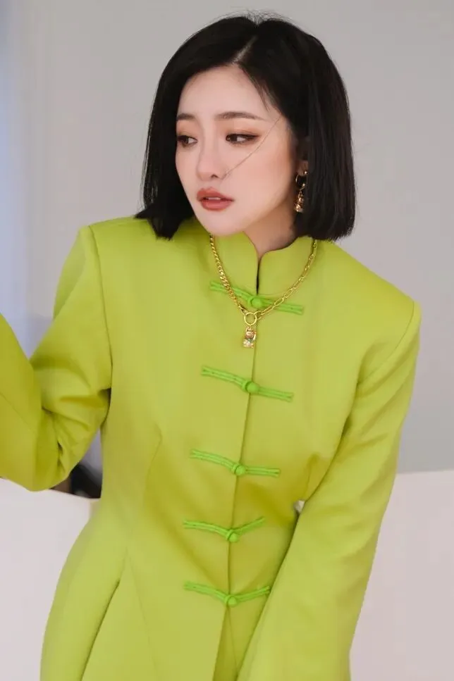之前我也用一套生命绿的中式竹节盘扣套装,搭配了虎纹单鞋和招财猫的珠宝,来塑造属于我的个人的新中式,这套大家都说眼前一亮很喜欢👇