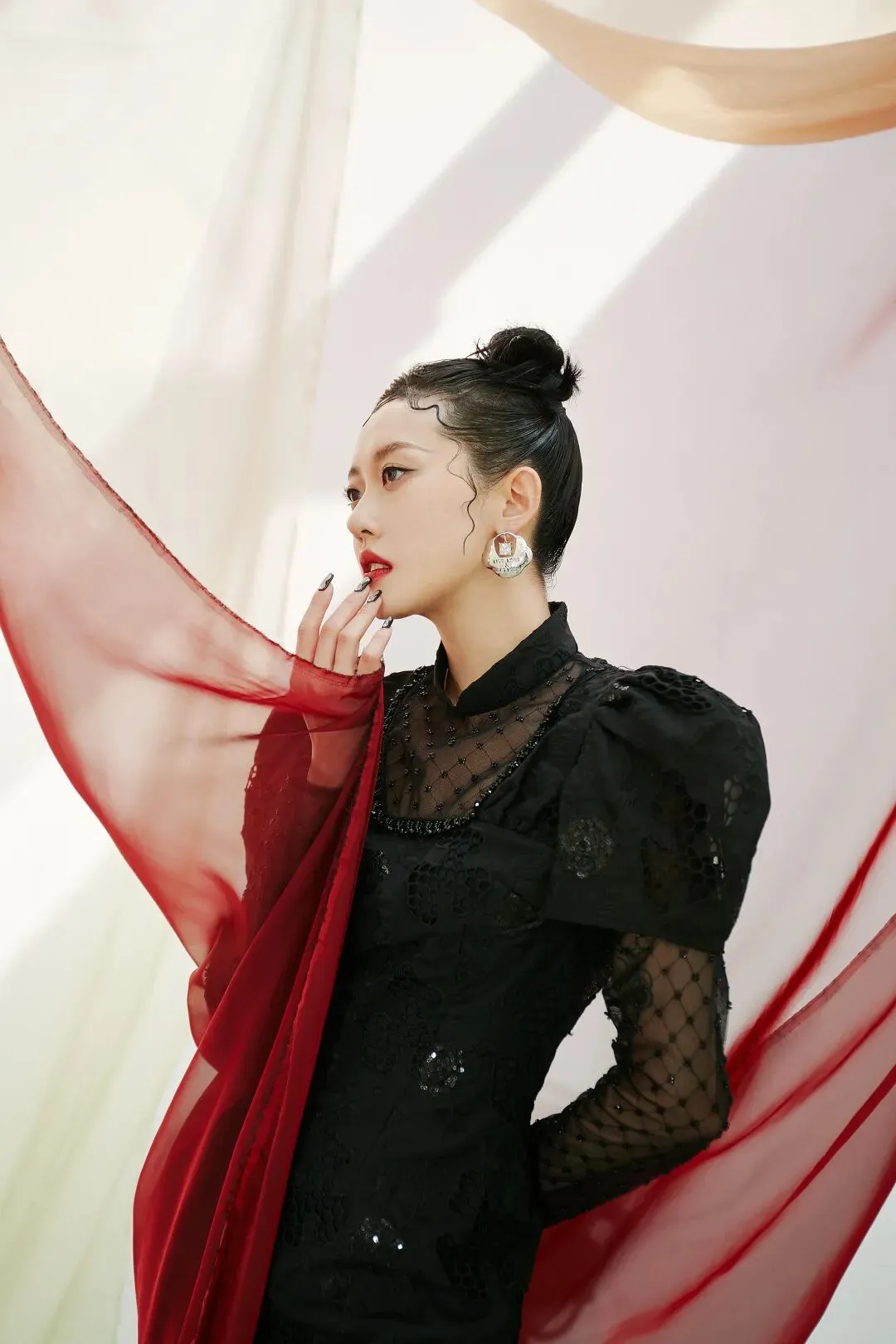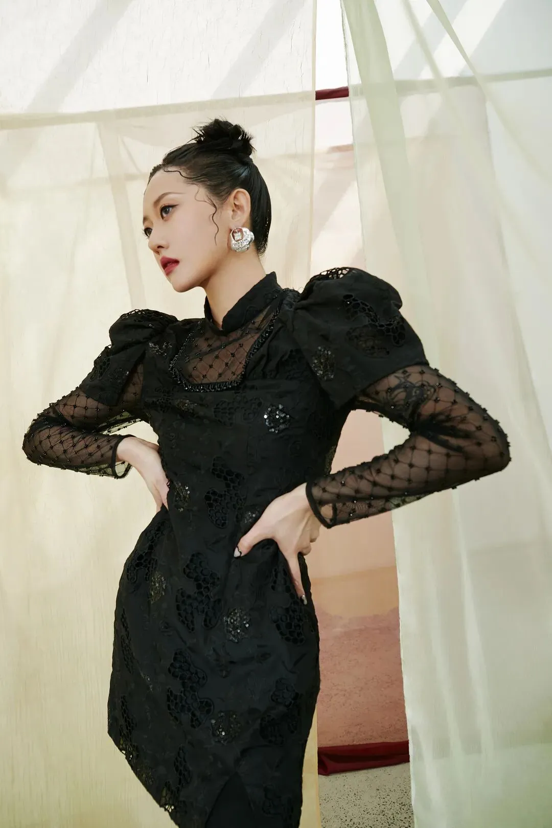 盘口镂空的领口设计,保持了传统旗袍的那份妩媚与性感,由透明薄纱衔接的宫廷袖,则增添了甜美与俏皮的气质。