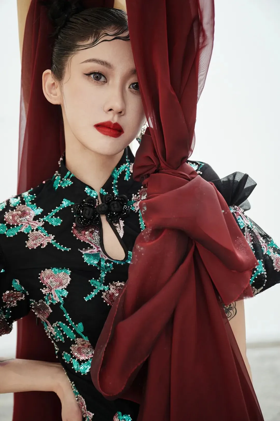 同样是改良旗袍连衣裙,同样运用了传统珠绣工艺,但是第二套新中式的造型却俨然是另外一种又甜又辣的新风格。