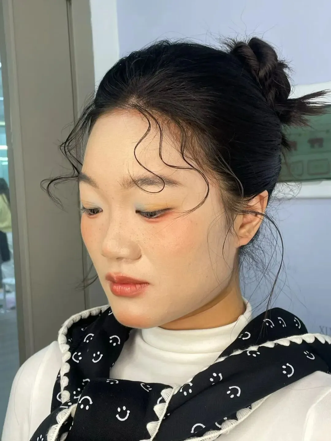 下午五点半,历时3.5个小时的妆面终于完成了!包括发型在内。我凑到镜子面前,有被惊艳到了——底妆没有假面感,野生眉画得恰到好处,眼妆是蓝黄渐变像浸了阳光的日杂感,保留了我的原生五官,比平时精致了不少,连我妈看到照片都问“这是你自己化的?”