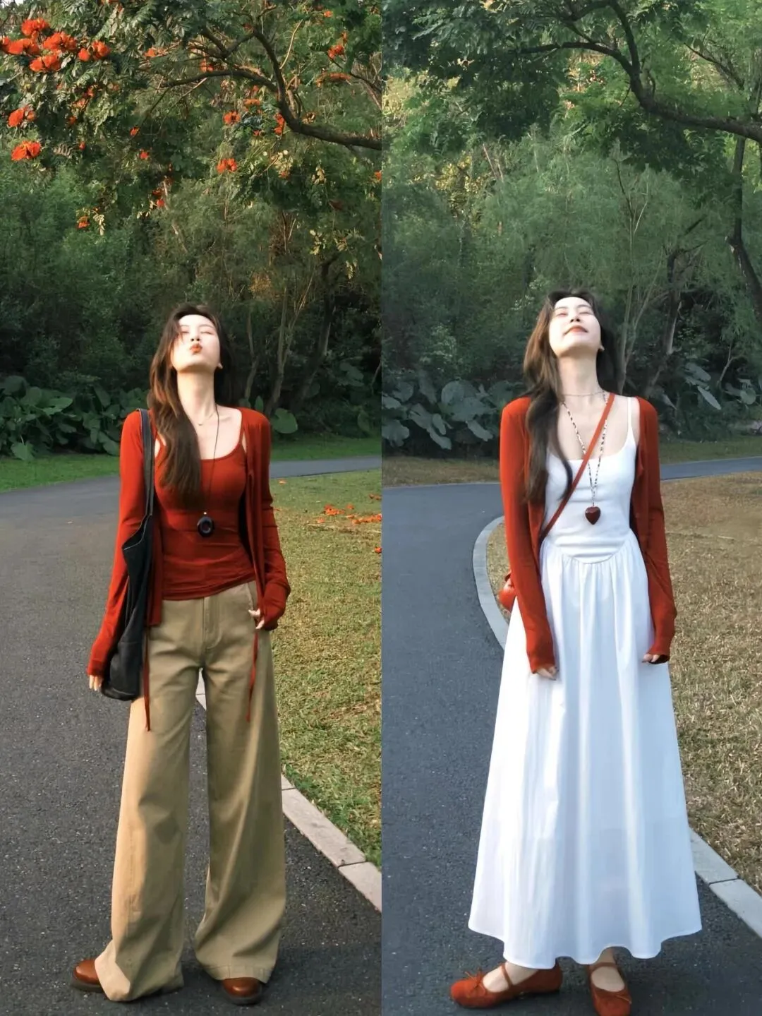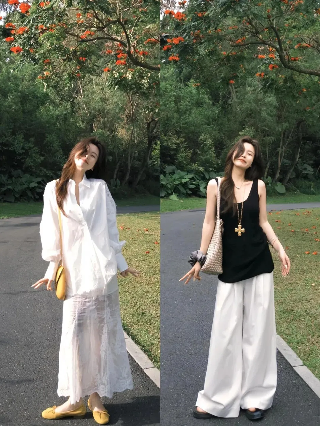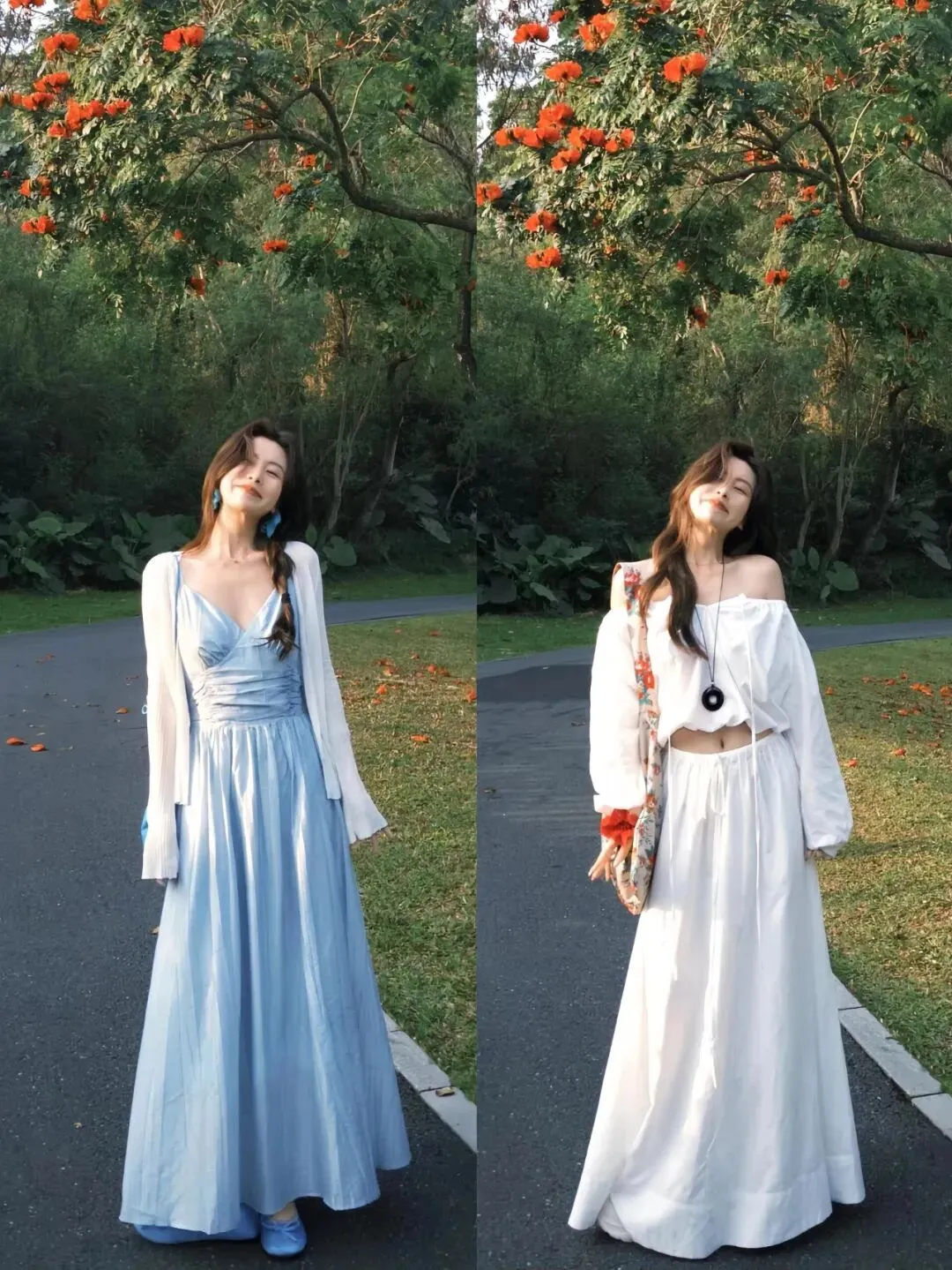 ,感觉特别仙气。搭配一双亮黄色的鞋子或一个小包,就能瞬间提亮整体。在绿树红花的背景里,这一身让自己感觉格外放松,好像和自然融为了一体。