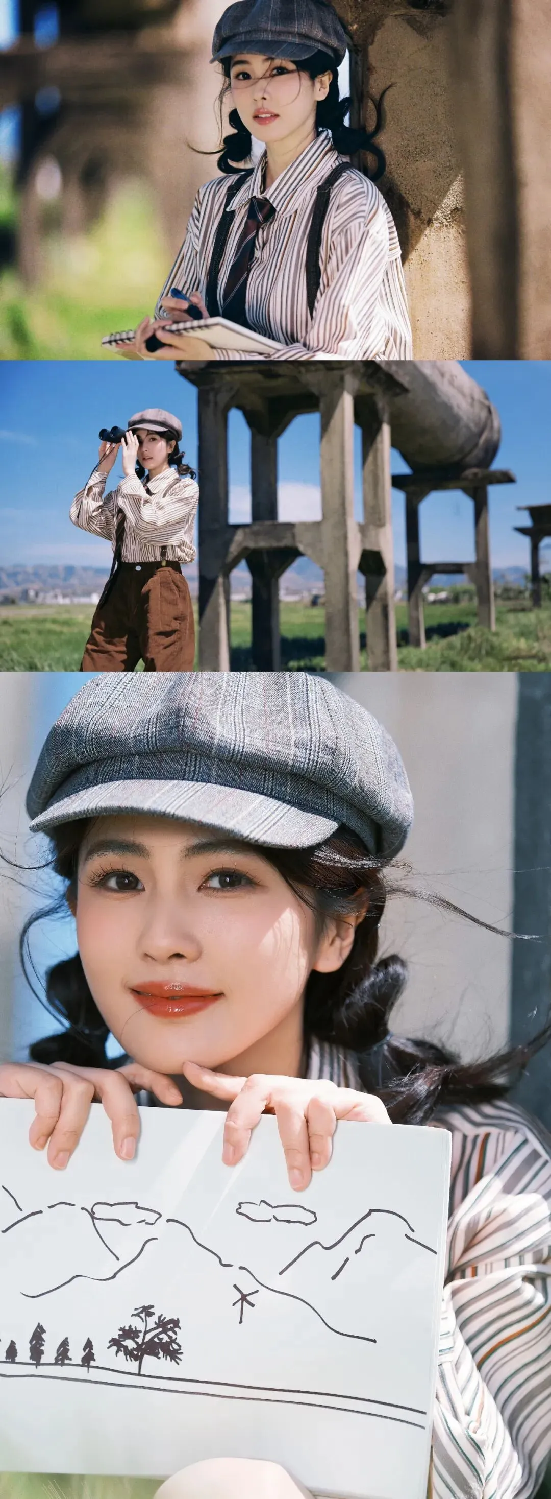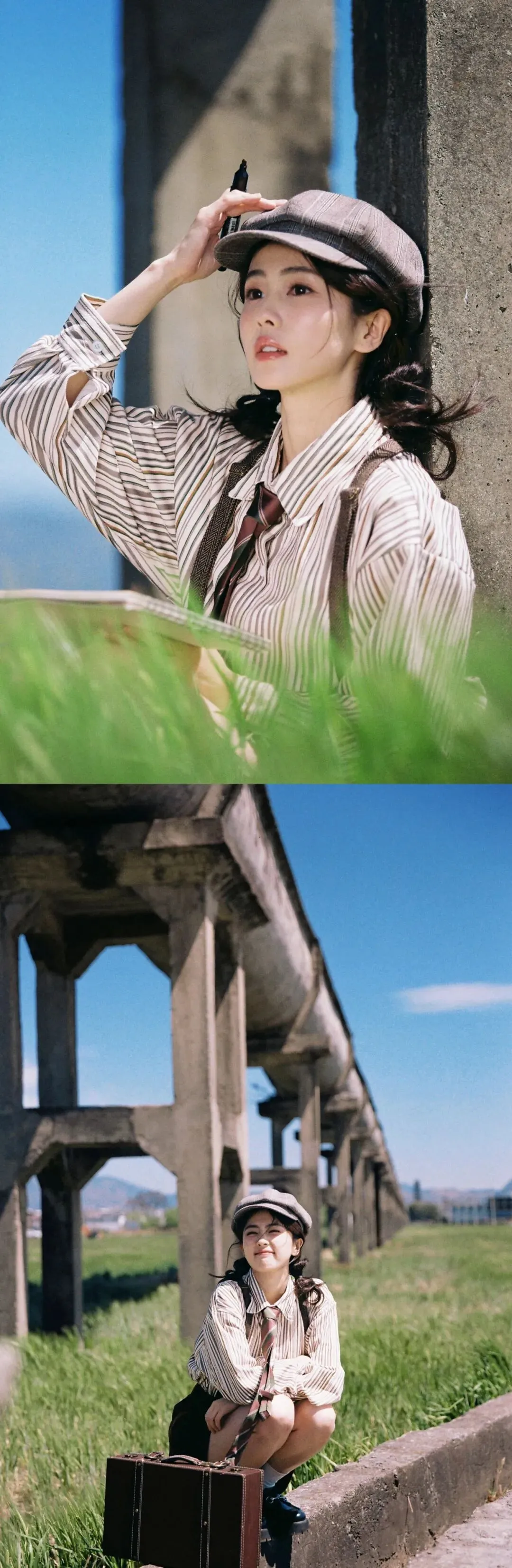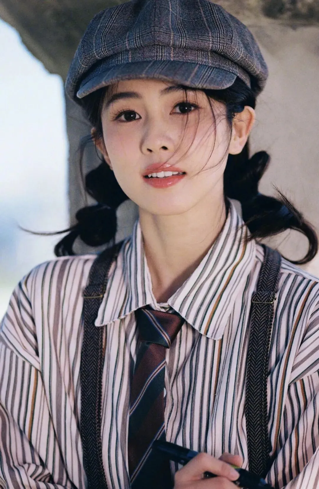报童帽、条纹衬衫、背带的英伦复古穿搭