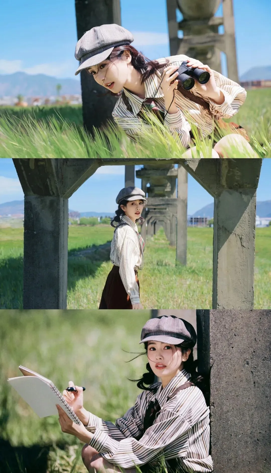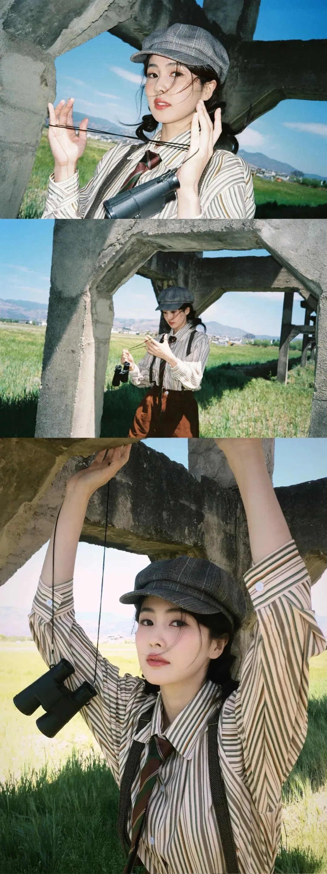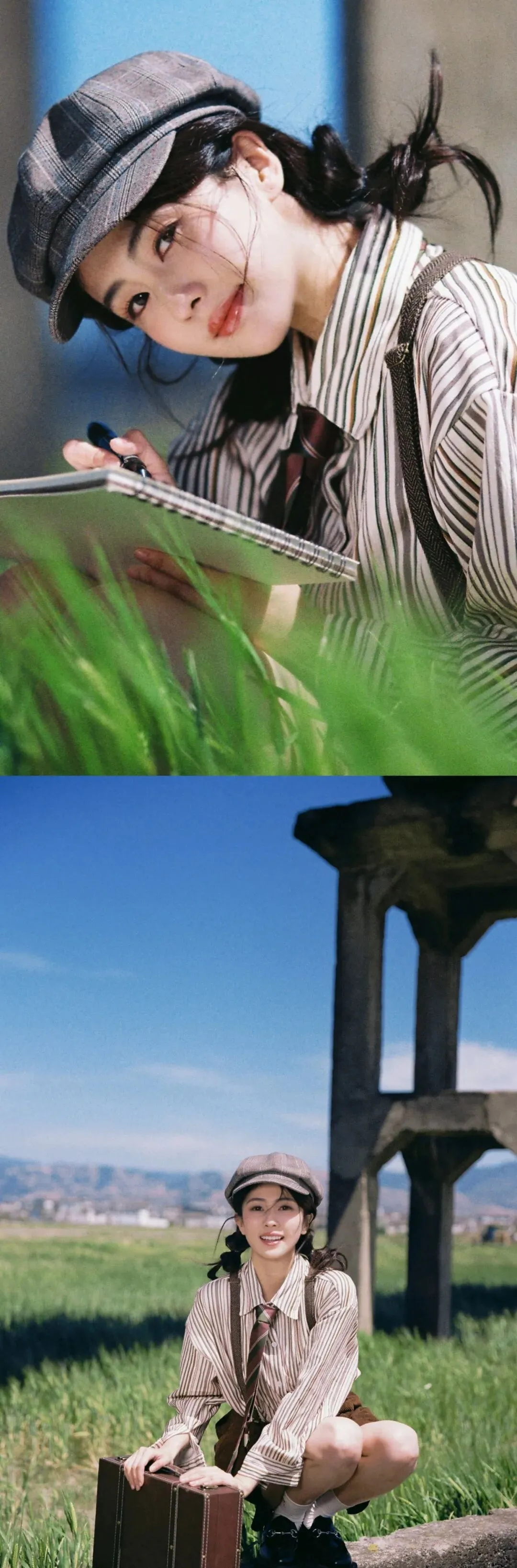 报童帽、条纹衬衫、背带的英伦复古穿搭