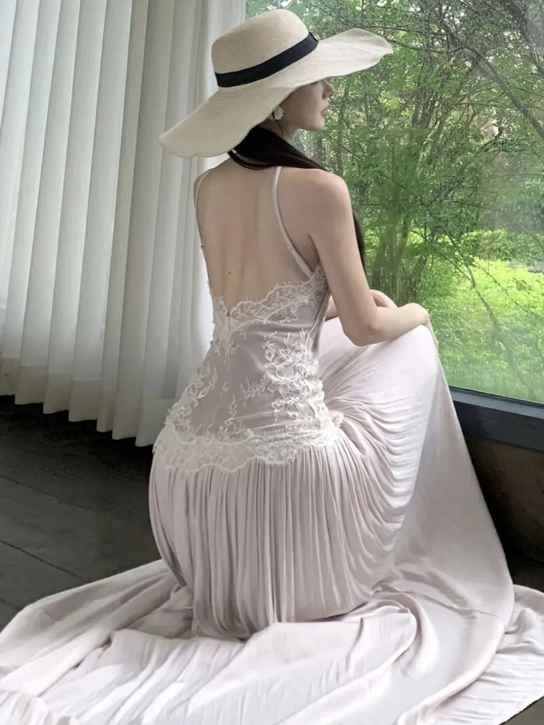 再看蕾丝+网纱的细节,这才是这条裙子的灵魂所在!上半身用半透网纱打底,叠加精致的白色蕾丝刺绣,花朵纹路细腻又高级,边缘的毛边设计还带点小随性,不会显得刻意做作。网纱的微透感刚好露出一点点肌肤,朦胧又撩人,完全不会低俗,把“欲”的尺度卡得刚刚好!而且蕾丝的立体剪裁还能修饰上半身线条,肩颈线条、腰腹曲线都能被悄悄优化,对身材的包容度超高,微胖姐妹也能放心冲!