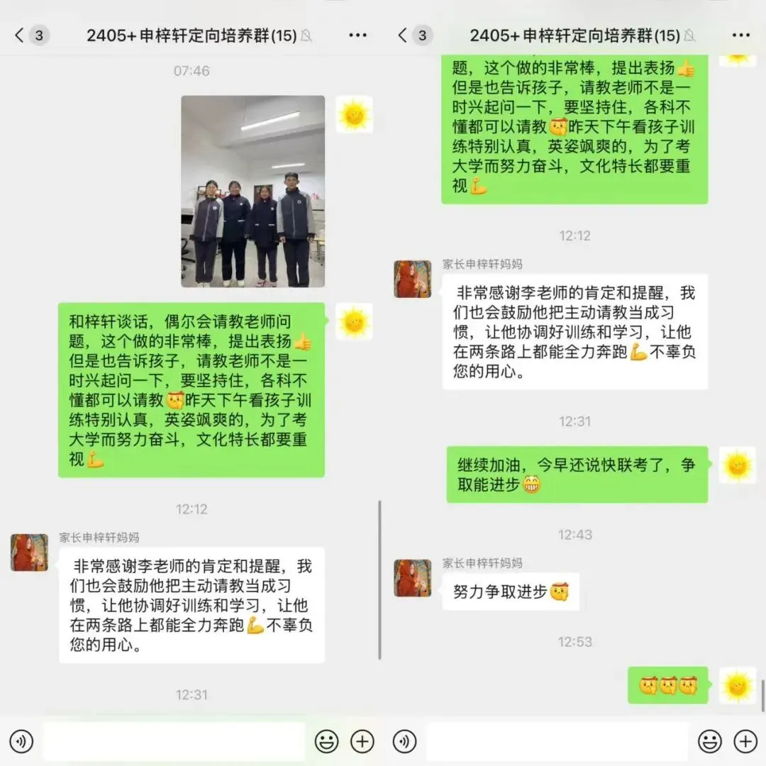 对申梓轩:“偶尔会请教老师问题,这个做的非常棒,提出表扬!…文化特长都要重视。”(家长回应:“感谢李老师的肯定和提醒…让他协调好训练和学习,让他在两条路上都能全力奔跑…”)