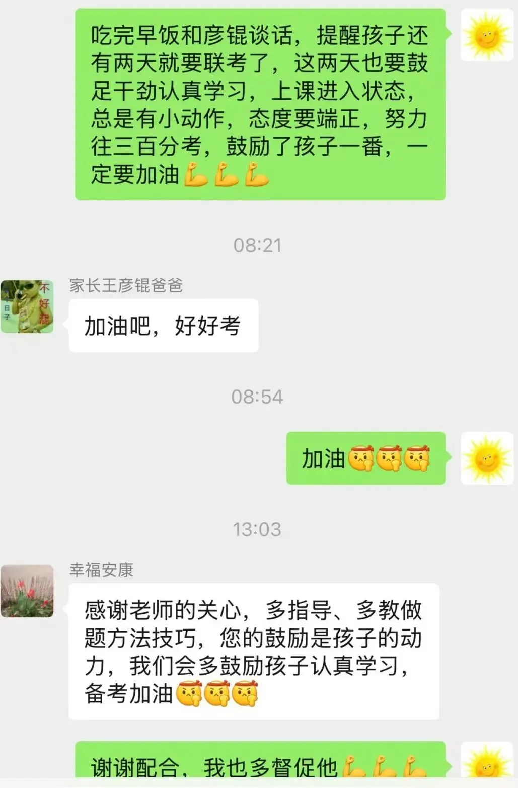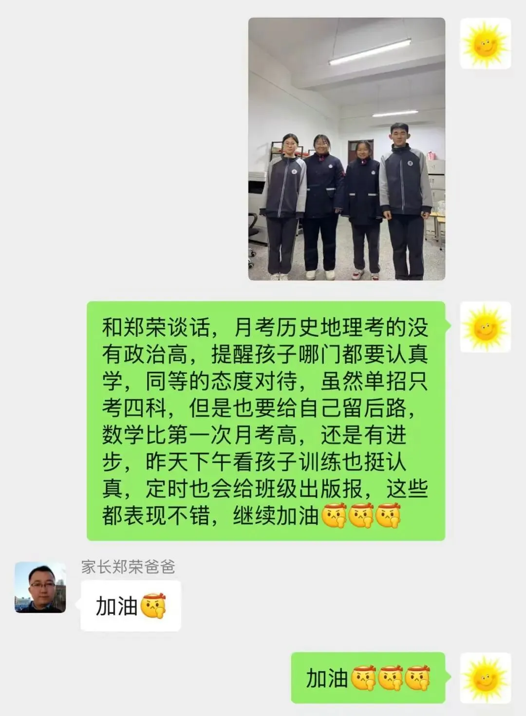 对田耀琛:“马上要联考,自己要多上心…上次月考比期中考试倒退了…上课提高课堂效率,背诵要跟上,最近三天好好努力。”(家长回应:“加油”)