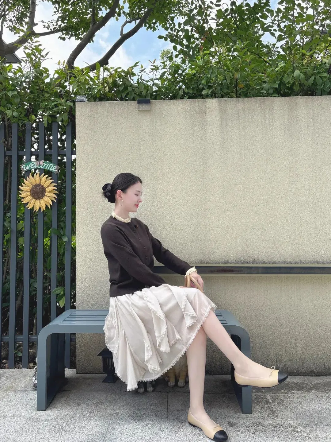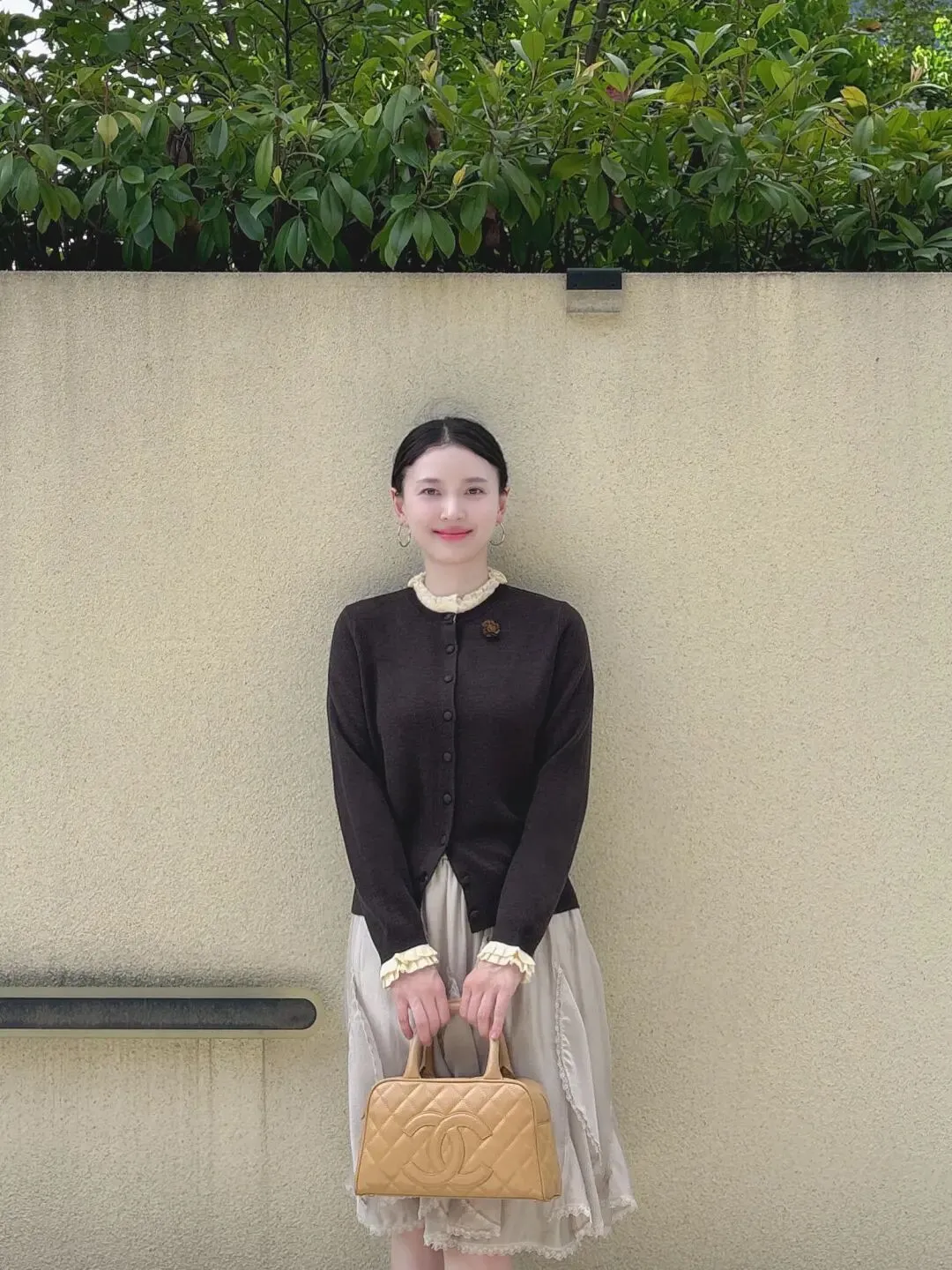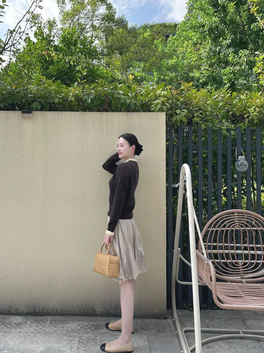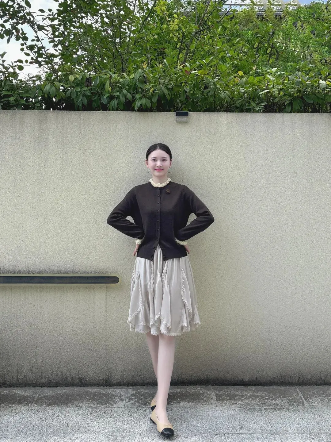 黑色圆领针织开衫搭白色蕾丝半身裙,收出纤细腰线,衬出温柔曲线!珍珠项链一戴,复古韵味揉进法式优雅,往庭院墙边一靠,松弛又精致,氛围感直接拉满~