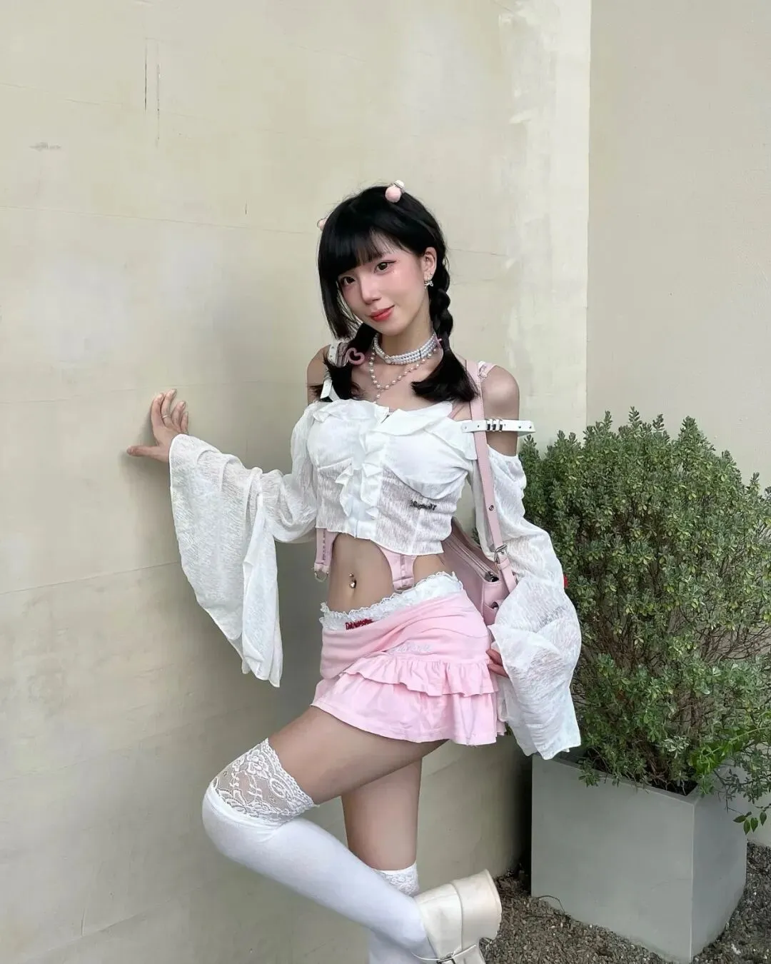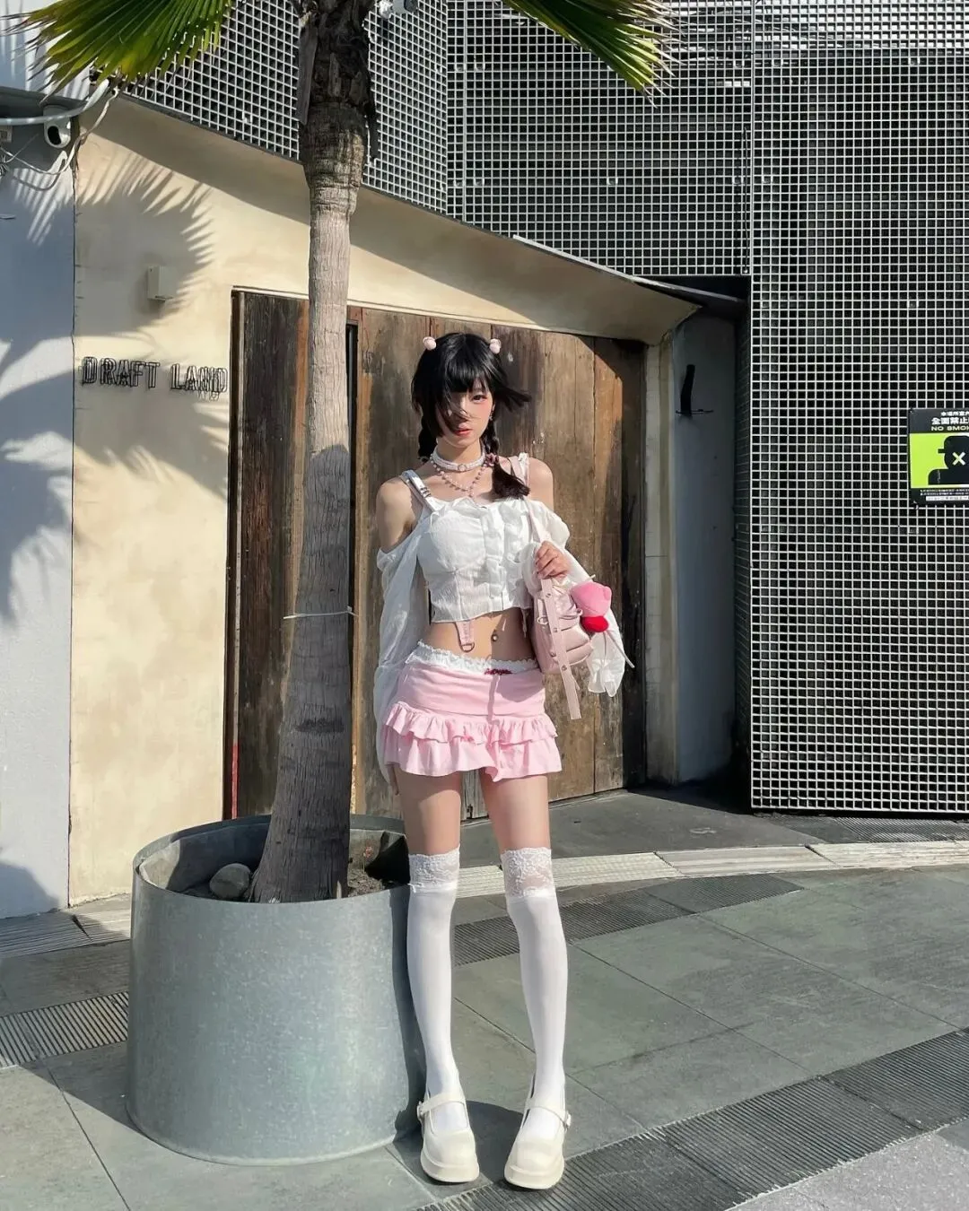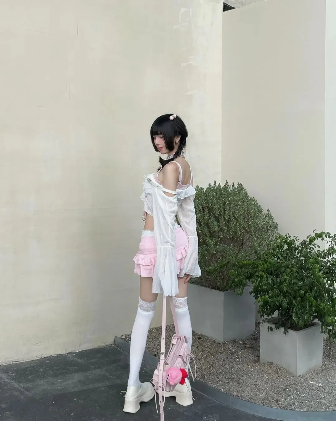 很多人穿短裙不敢摆动作,其实越是露肤度高的穿搭,越需要肢体去“占满”画面的视觉重心。手中的粉色玩偶包也别闲着,它是解决“手不知道放哪”的最佳道具。