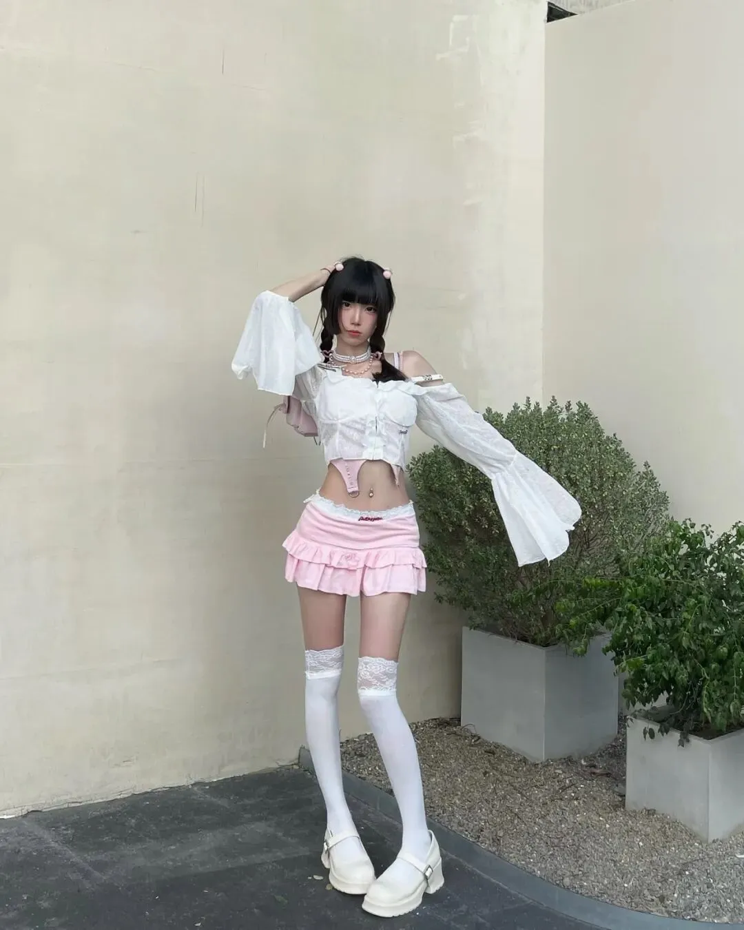 穿搭适配的场景方面,当服装是高饱和度的粉色或复杂的蕾丝元素时,背景必须做减法。首选水泥灰、米白色的极简建筑墙面,或者有规律线条的金属背景,切忌背景颜色过杂。
