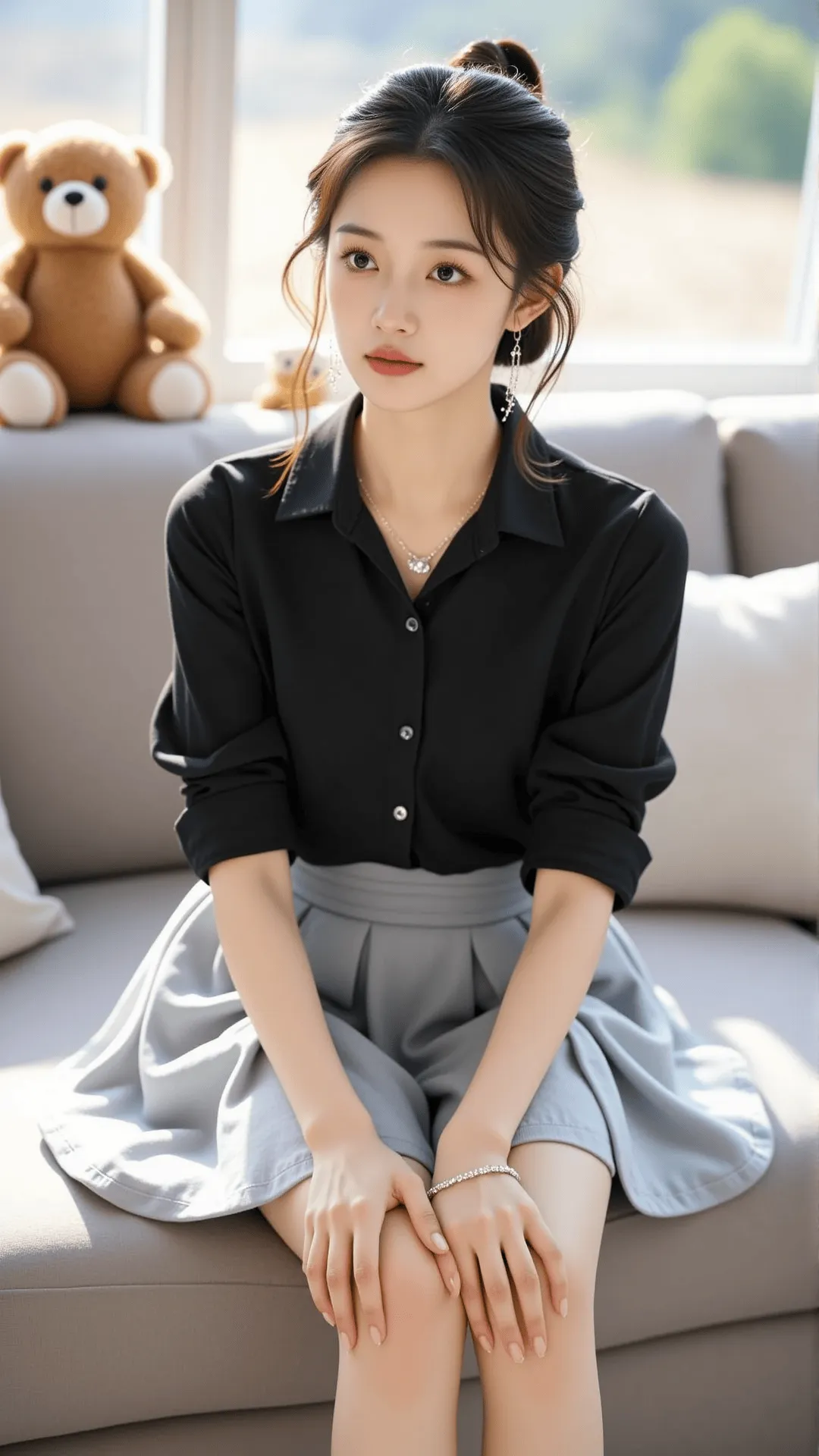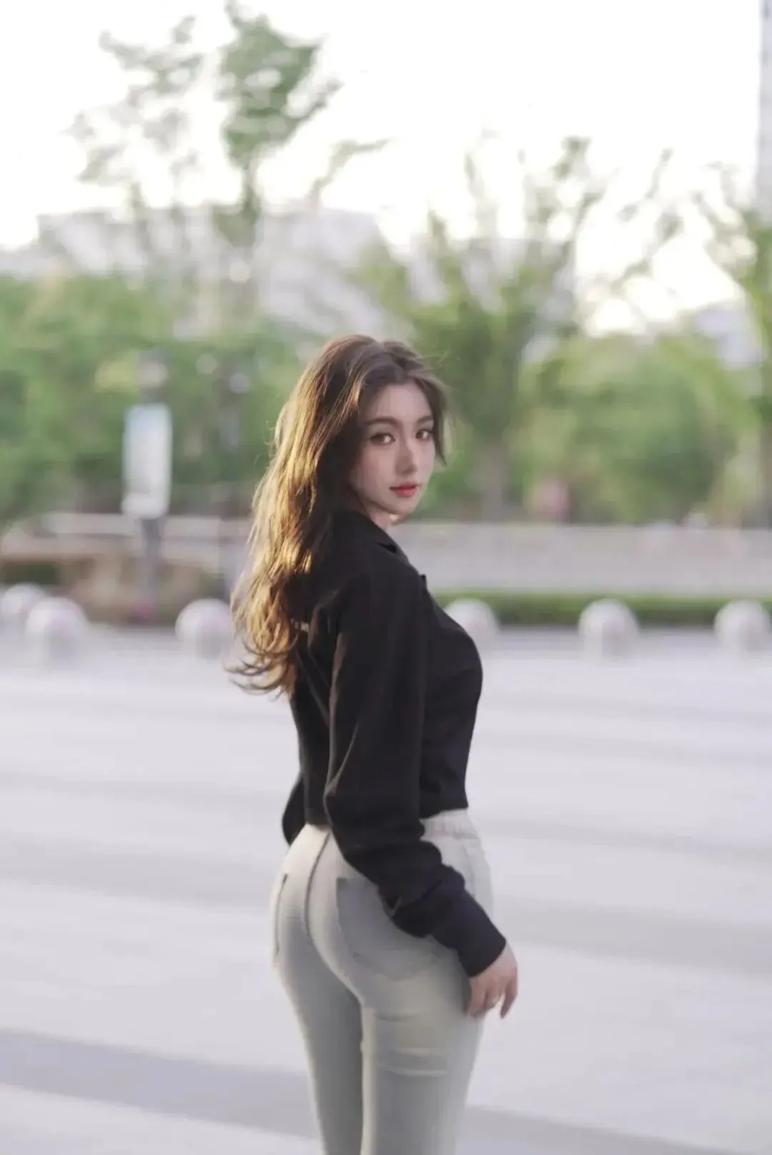 就在那个抬手的瞬间,从心里,或者从这片无边无际的蓝色背景里,我忽然清晰地“看见”了自己——那件简单的小背心,因为它妥帖的包裹和极致的短,从腋下到腰侧,每一道向内收束的惊心弧线都被诚实勾勒,侧腹凹陷下去的阴影在秋日清澈猛烈的天光下简直无所遁形,腰肢的纤细被身后沉静的城市轮廓和浩渺的蓝天反衬得充满一种脆弱的、蓬勃的生命力。而下面这条裤子,才是沉默的叙事者。破洞的设计带着不羁的街头感,可它的剪裁偏偏什么都懂。高腰线死死卡在胯骨之上,当我微微侧身,或者只是感受心跳,它能从腰间那道最纤细的、被明确标记出的“起点”开始,用一种“懂得”的沉默,让裤身的包裹顺从地覆上因站立而自然绷紧的髋部,然后在后方被一股扎实的、充满存在感的生命力稳稳地、充满感恩地撑开,形成一个圆润挺翘到堪称完美的形状。我就这样站着,在秋日这片被蓝色和自由包裹的盛大里,什么也没做,只是和自己、和一阵好风待在一起。原来最生动的嚣张,真的可以又甜又酷,一件旧背心,一条破洞裤,一双蕾丝袜,一片好天气,就足够了。