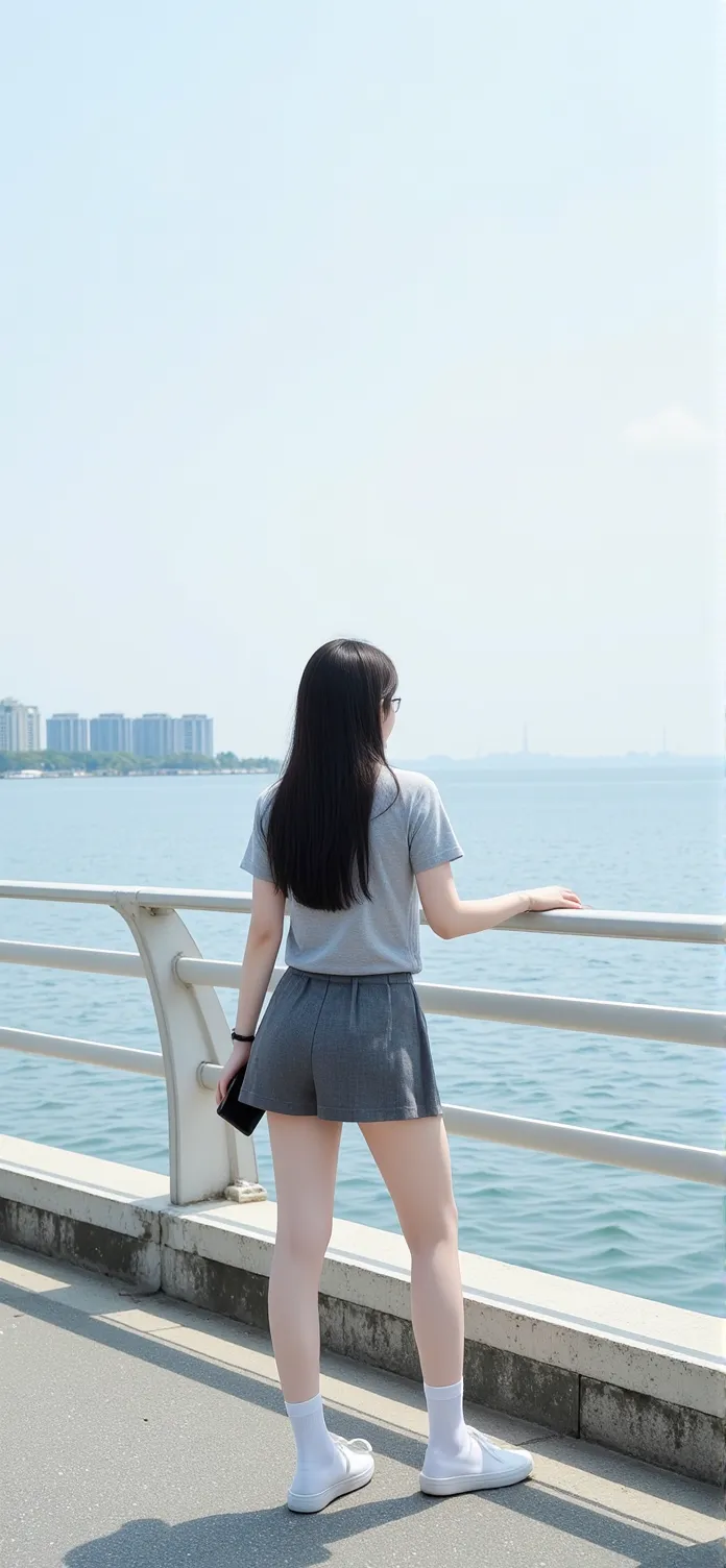 说真的,那天出门前套上这件白色小背心,棉质的料子软软地贴着皮肤,两根细带子刚挂上肩膀,整片后背和腰侧那一圈肌肤就猝不及防地掉进秋天有点干爽却明亮的空气里,我轻轻“嘶”了一声,但那点凉意马上就被一种带着小小放肆的醒神感取代了,比喝冰汽水还得劲。下面这条蓝色的破洞牛仔短裤,是我衣柜里穿到边角都磨出毛边的旧爱,颜色被洗得发白发亮,在阳光下干净得晃眼,我习惯性地把它使劲往上提到肚脐眼上面,高腰头“咔”一下卡死的瞬间,腰是腰,腿是腿,分得清清楚楚,所有属于身体的曲线都在那一刻被明明白白地规划好了领地。我最先注意到的,其实是慢慢穿上这双白色蕾丝大腿袜的过程,冰凉的丝滑感从脚尖一路爬到大腿中部,袜口那圈精致的蕾丝花边刚好卡在最饱满的地方,带来一种心照不宣的束缚感,和短裤边缘之间,明明白白地划出了一道被称为“绝对领域”的肌肤,在蓝天的映衬下白得晃眼。我踩上那双简单的白色鞋子,整个人就轻快地出了门。站在开阔的地方,