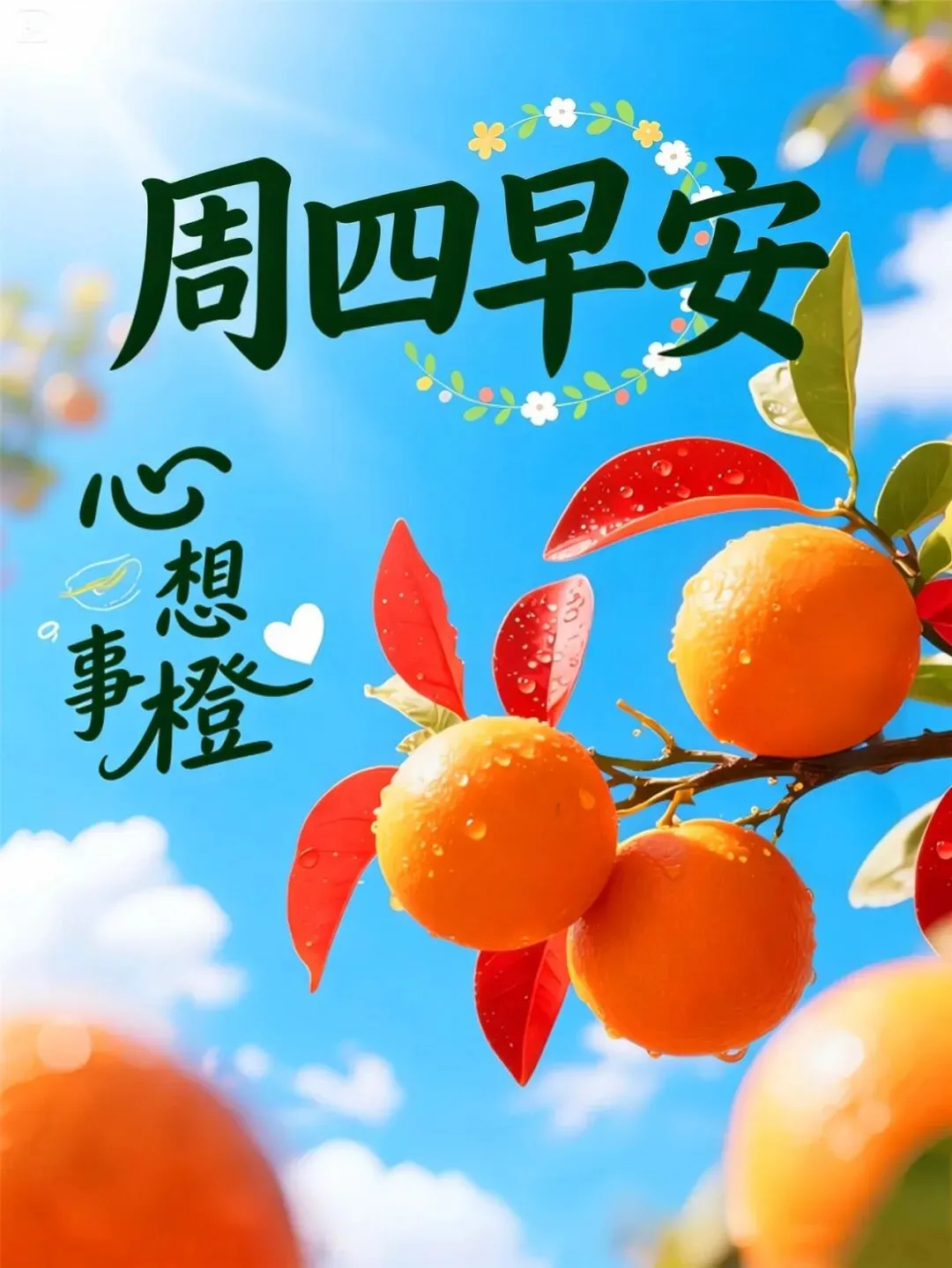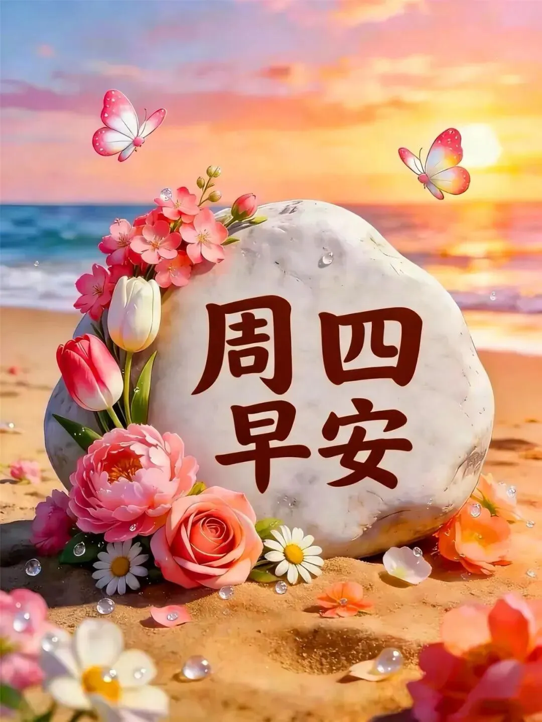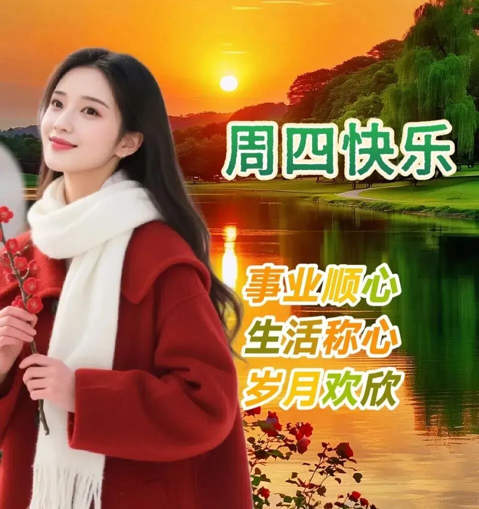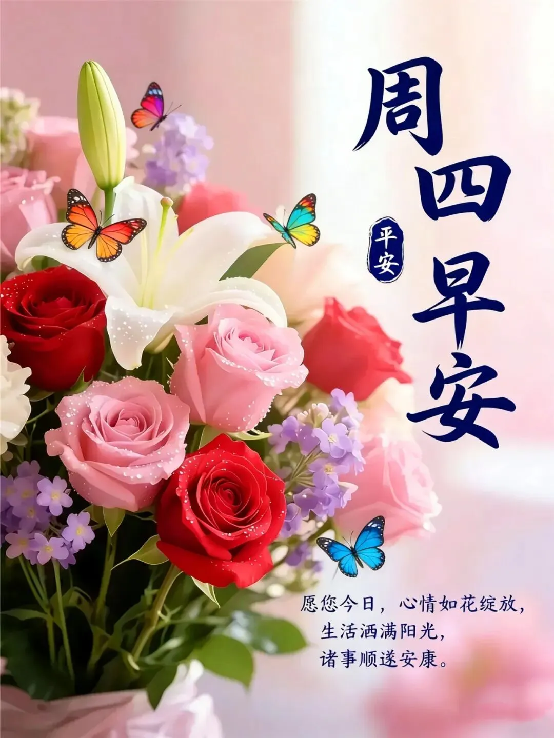 醒来问声好,祝福要趁早,早餐要吃饱,衣帽穿戴好,出门开心笑,踏过幸福桥,老友一见面,忙把平安道,祝你心情好,快乐每一秒,周四早上好!