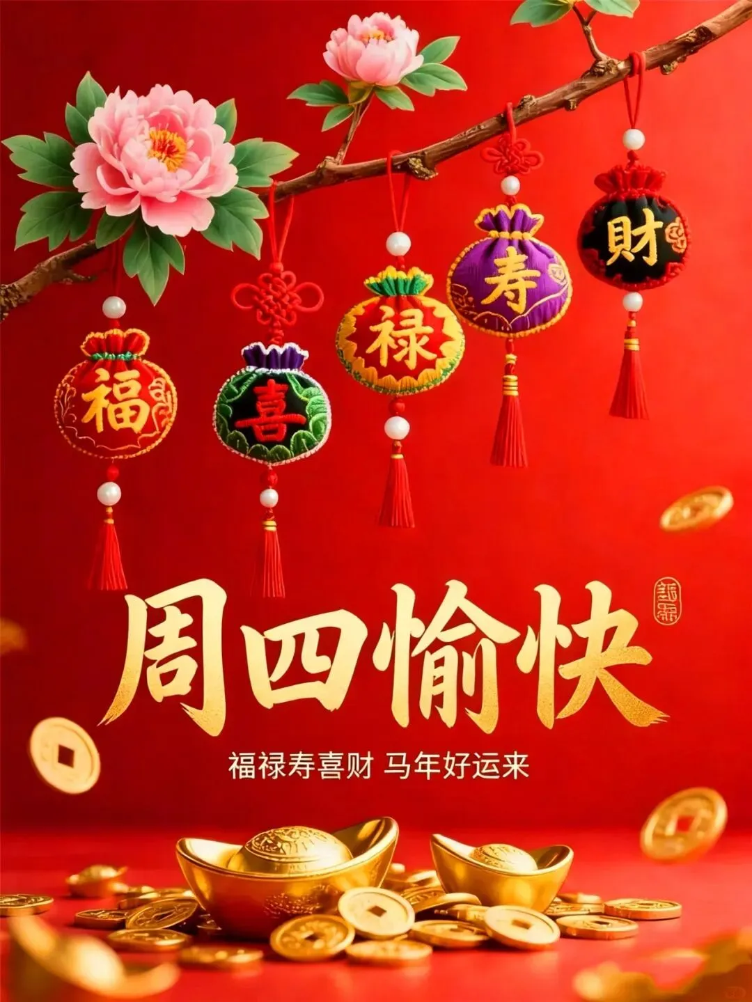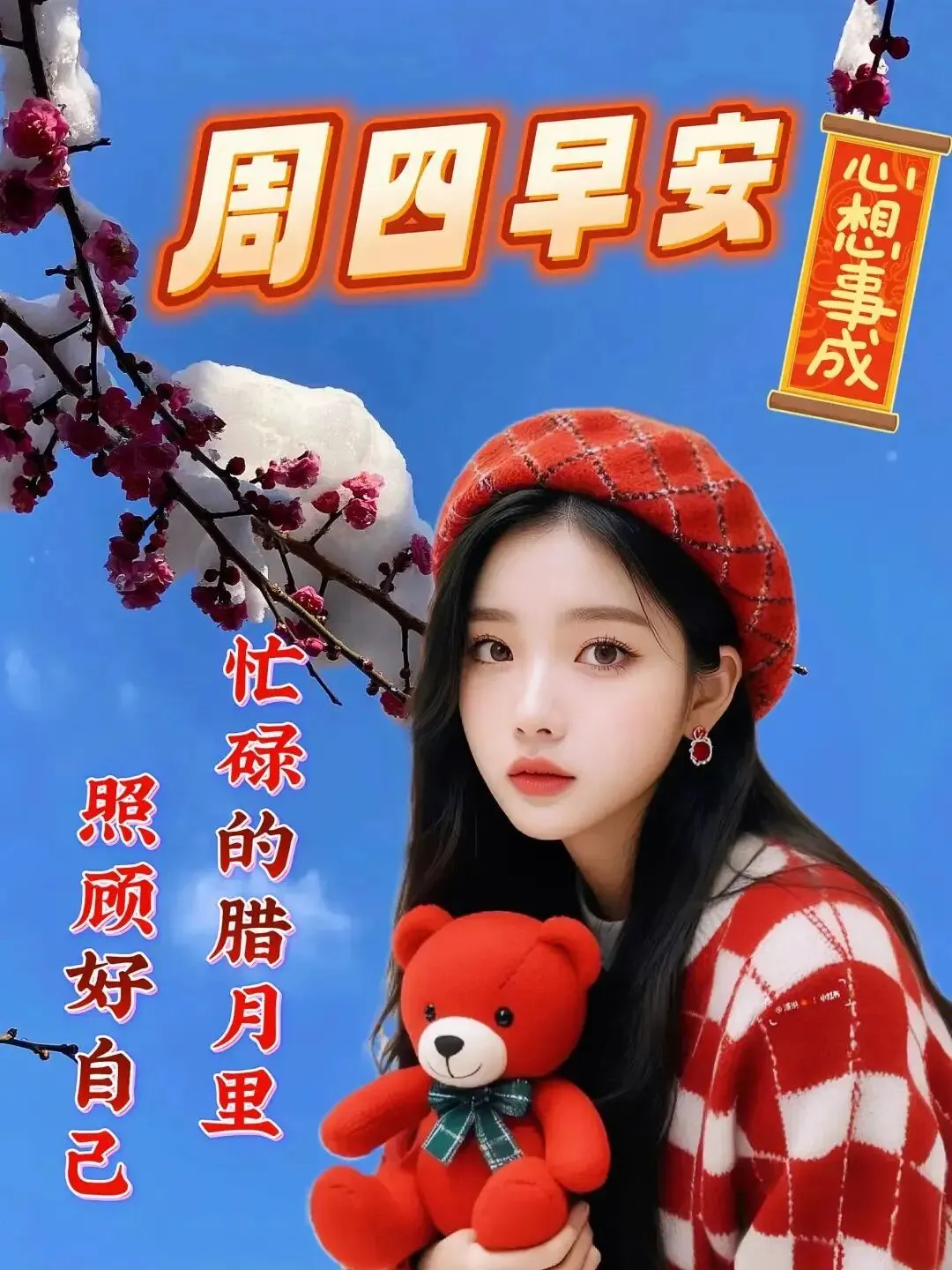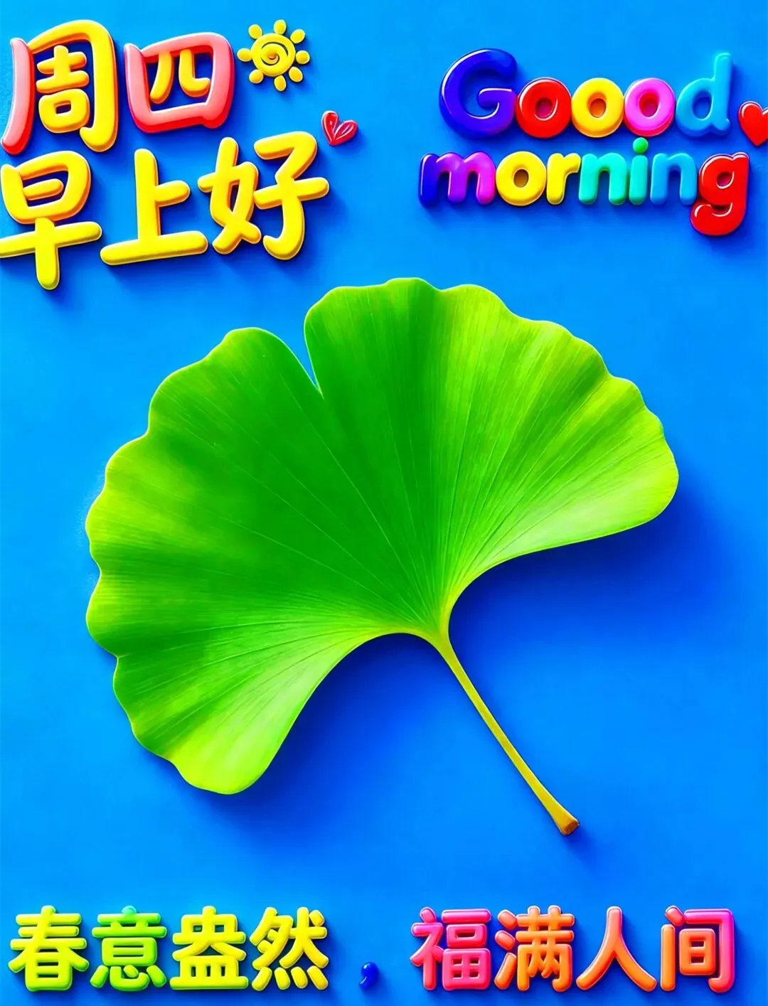 醒来问声好,祝福要趁早,早餐要吃饱,衣帽穿戴好,出门开心笑,踏过幸福桥,老友一见面,忙把平安道,祝你心情好,快乐每一秒,周四早上好!