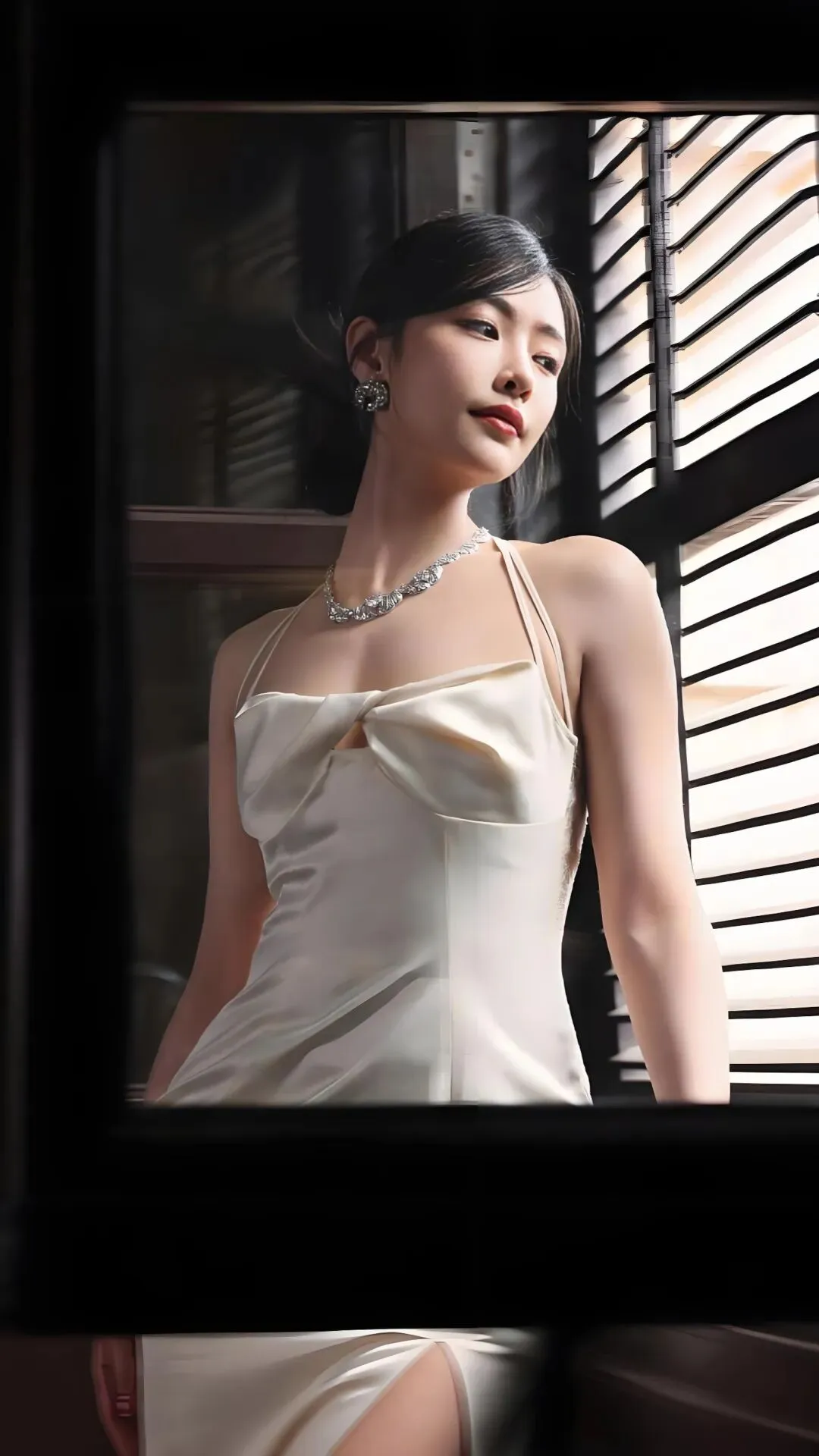 仿佛月光倾泻于初雪之上,每一寸都写满了无瑕的诗意。光线在她轮廓上流连,勾勒出柔婉又灵动的线条。