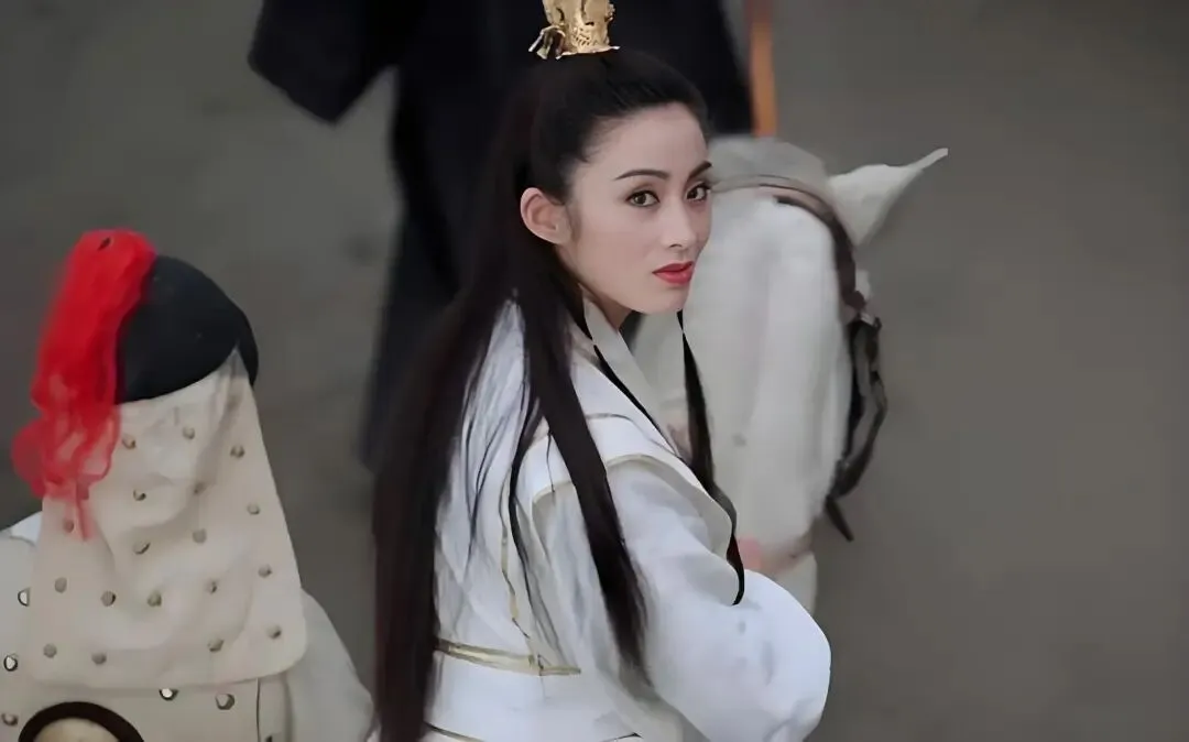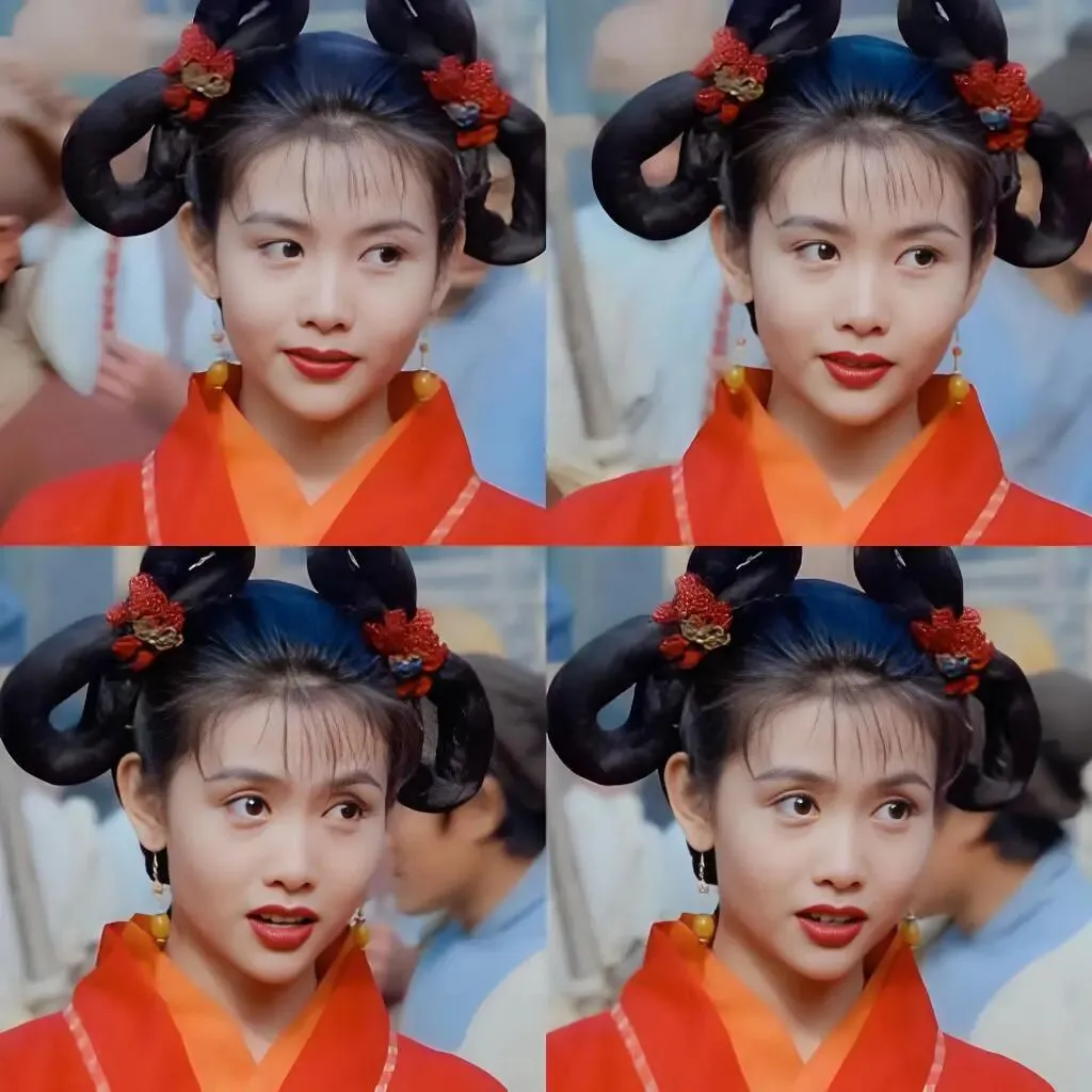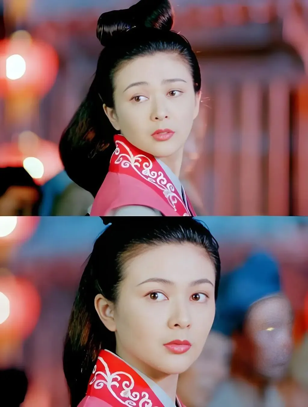 1993年《倚天屠龙记之魔教教主》中的赵敏则将她古装造型的潜力发挥到极致。影片中赵敏在41分钟左右出场,一袭白衣、一把纸扇,眼神如闪电般清亮。那个骑马回眸的镜头,被称为国产电影史的”最美回眸”之一——面纱被风掀起的瞬间,她的眼神从冷冽转为温柔,嘴角微扬却暗藏试探,将郡主的高傲与少女的心动凝于一刻。