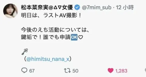 也难怪她要退社离开事务所了,因为不用艺术创作了,所以也不用研究离开事务所后松本菜奈実和出品方之间要如何连结了;第二个重点则是松本菜奈実有提到,今后艺术创作的活动(えち活动)将会在私*蜜的小帐公布ー在这边和大家介绍一下,松本菜奈実用的是「键垢」,键,就是钥匙的意思,也就是说这帐号是有上锁的,必须要松本菜奈実同意才能追踪,现在是只要追踪她就OK,之后就不知道了⋯