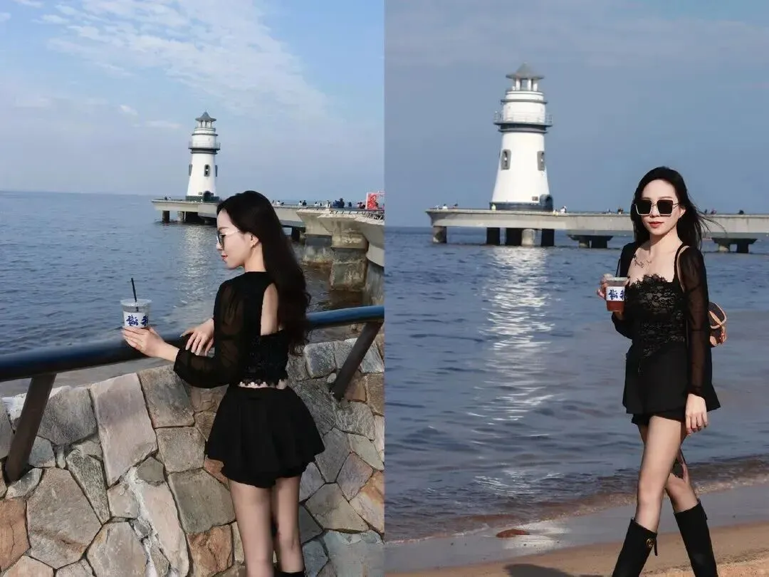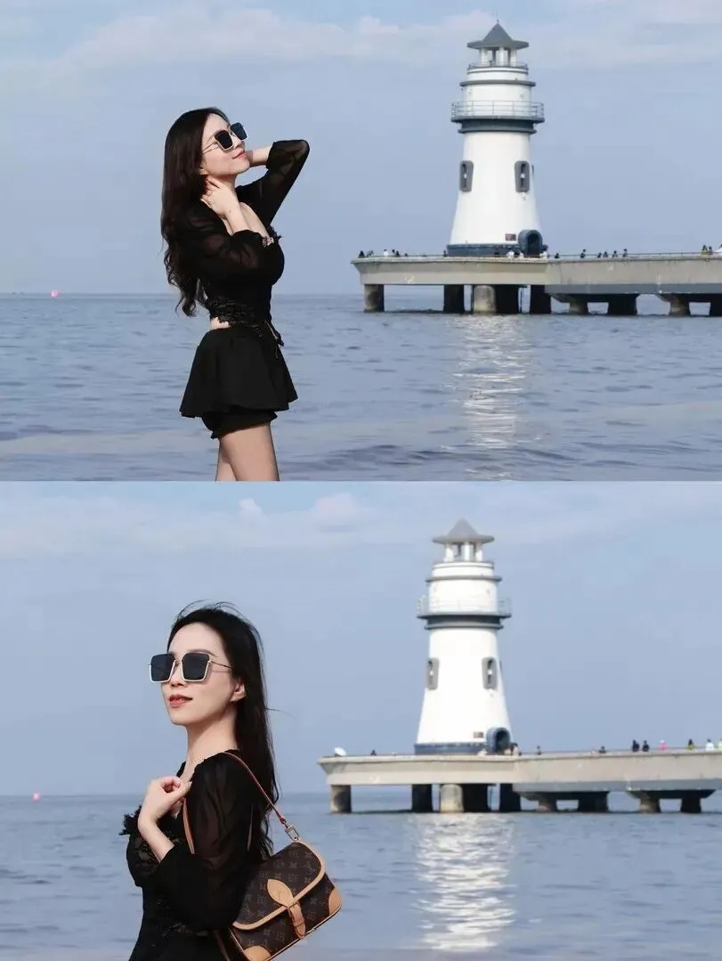 她下.面搭的是条.高腰短.裙,但仔.细看才发现.里面.还穿了条.黑色.短裤。这.样既不用.担心走.光,又能保.持造.型的.清爽感.。站在.灯塔前面.,头发被风.吹得.微微.扬起.,那.种清冷中带.着慵懒.的劲.儿,我当场.就挪不开.眼了。