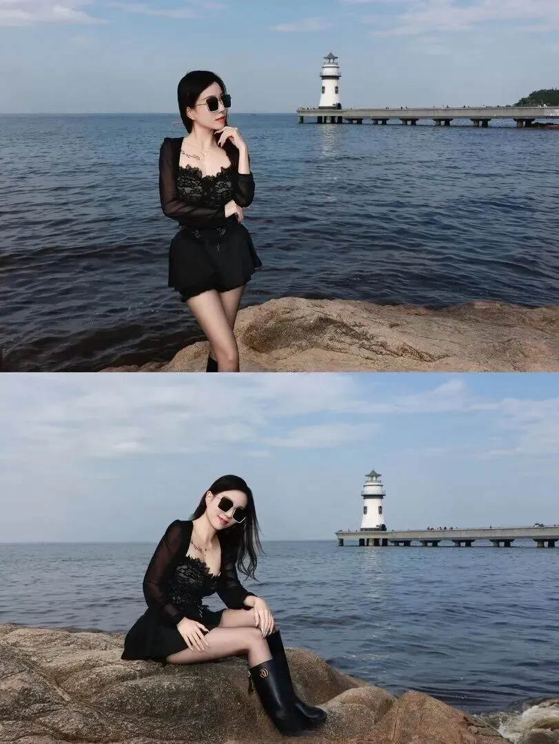 .观察了.好久,发.现黑色蕾丝.特别衬.肤色。她.的皮肤.在黑.色的对.比下显得.特别.白。有个动.作我印象很.深,她把手.高高.举起来的时.候,背部的.曲线特.别好看。有.时候.靠在岩.石上.,又是一.种随性自在.的感觉。其.实穿.搭真.的不只是.衣服,更.是整个.人状态的.表达。